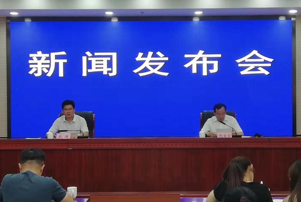 安徽省委宣傳部新聞發佈處處長武瀟(左)主持新聞發佈會,省統計局副局長趙金寶介紹上半年全省經濟運行情況