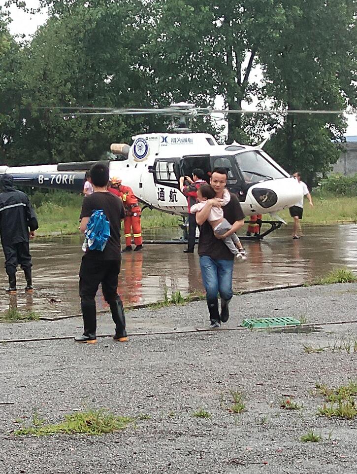 7月10日,茶山鎮兩名產婦即將臨盆,其中一位羊水已破並且見紅,但當時道路被洪水阻斷,急救車輛無法通行,千鈞一髮之際,鎮衛生院聯合鎮政府緊急聯繫省消防救援總隊航空救援大隊請求支援。上午9時,直升機從天而降,已經準備好的湖南師範大學附屬湘東醫院急救人員快速接管產婦,及時確保產婦及胎兒的安全。