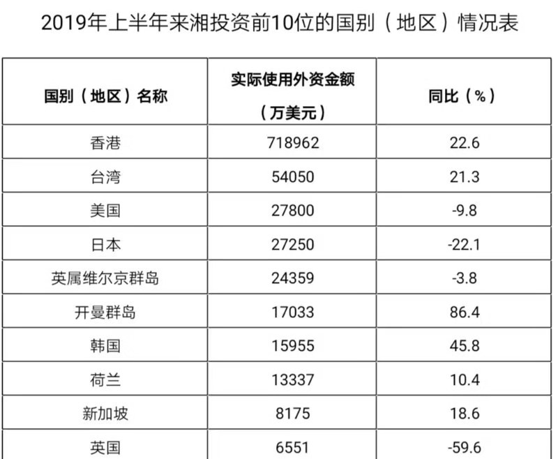【香港商報網訊】記者 李銀明 報導:記者從湖南省商務廳獲悉,2019年上半年全省招商引資實際到位資金4158.95億元,同比增長17 %。其中,實際使用外資95.74億美元,同比增長11.9%,完成年目標任務的53.7%;實際到位內資3512.95億元,同比增長17.9%,完成年目標任務的52.2%,均實現「時間過半,任務過半」。外資方面,湖南省最大的外資來源地為香港,今年上半年對湘實際投資佔到了全省總額的75.1%,同比增長22.6%;其他主要投資來源地中,台灣、開曼群島、韓國、新加坡等國家對湘實際投資均高於全省平均增幅;「一帶一路」國家實際到資1.47億美元。