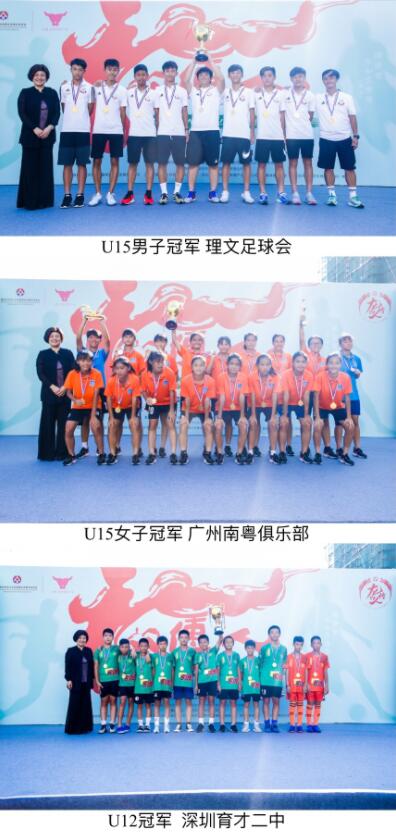 頒獎儀式上,來自中國兩岸四地的700多名青少年足球運動員,都收穫滿滿,臉上洋溢着榮耀之意。頒發的10大獎項包括冠亞季獎;優勝獎;「最佳人氣團體」獎、「最佳射手」紀念獎、「最佳守門員」紀念獎、「最佳教練」紀念獎、「最佳球員」紀念獎、「最佳風尚」紀念獎。其中,榮獲U12男子組第一名的是深圳育才二中;榮獲U15女子組第一名的是廣州南粵俱樂部;榮獲U15男子組第一名的是理文足球會。