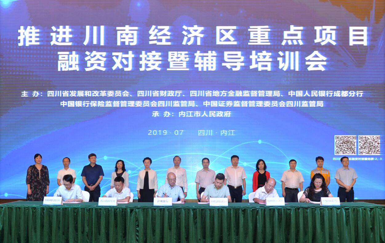 【香港商報網訊】7月25日,四川省發展改革委、四川省財政廳、四川省地方金融監督管理局、人行成都分行、四川銀保監局和四川證監局6部門主辦的推進川南經濟區重點項目融資對接暨輔導培訓會在內江召開。會上,川南經濟區9家重點項目業主與9家金融機構簽約,現場簽約金額72.04億元。