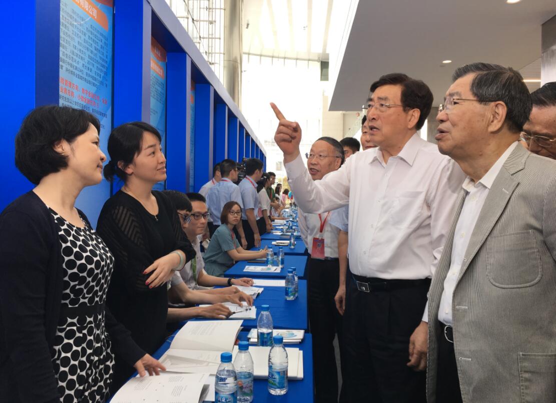 蕭萬長(右一)與郭金龍(右二)在兩岸青年菁英人才招聘會上與招聘台青的企業負責人交流
