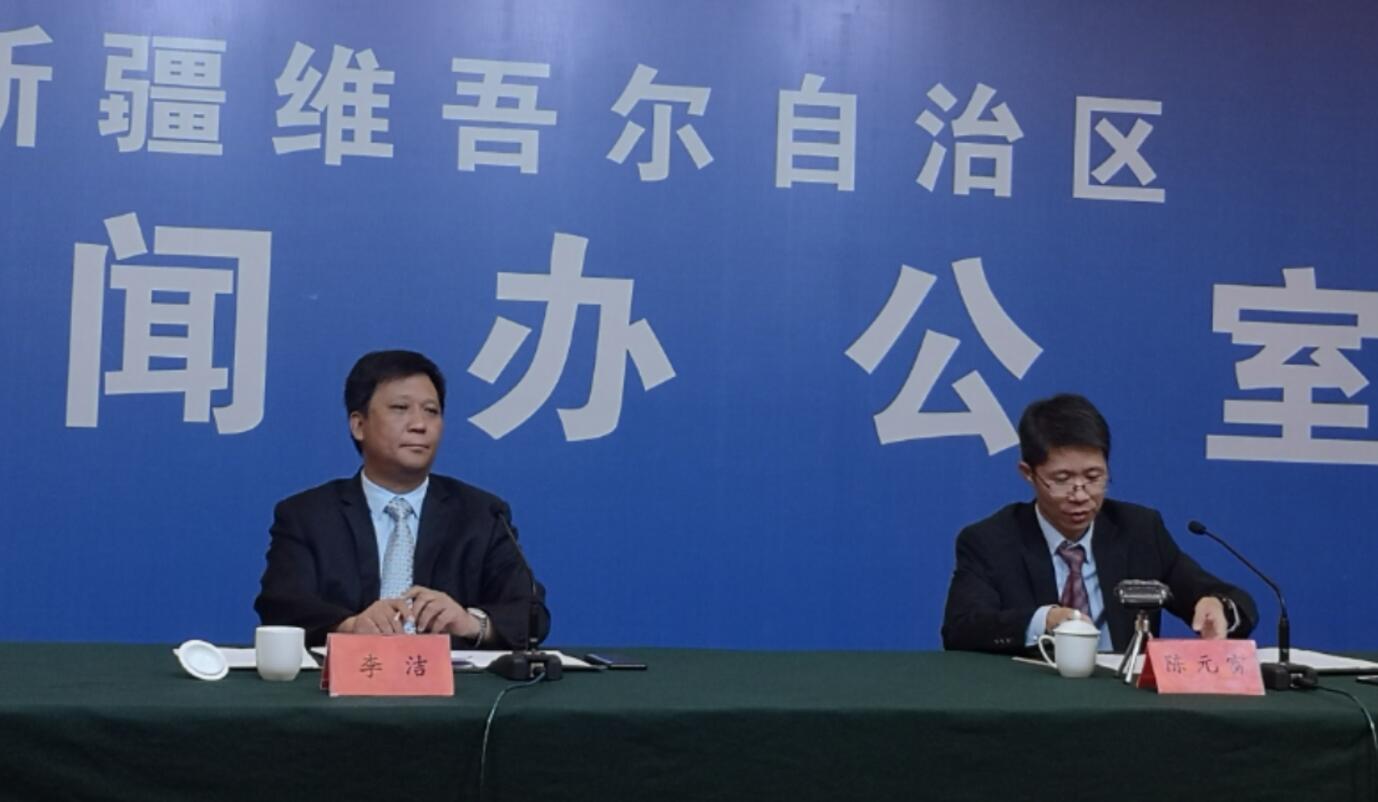 自治區新聞辦對外聯絡處處長李潔(左)主持新聞發佈會,中國人民銀行烏魯木齊中心支行黨委委員、副行長陳元富(右)通報情況
