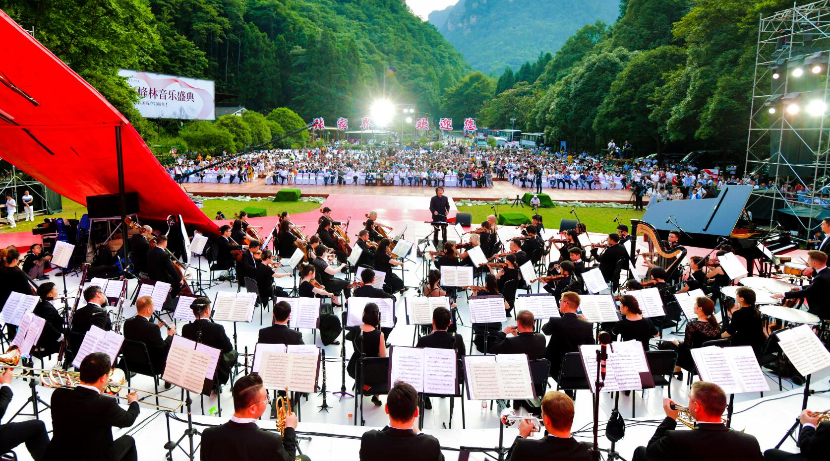 【香港商報網訊】26日下午,世界首個峰林音樂盛典在旅遊勝地湖南省張家界武陵源風景名勝區隆重舉行。本次音樂盛會為2019黃龍音樂季重要內容,由著名指揮家、湖南交響樂團團長肖鳴執捧指揮,俄羅斯愛樂樂團及百多名中外音樂藝術家傾情演繹了《我愛你中國》《我的祖國》《紅旗頌》《紅色娘子軍》《保衛黃河》《我和我的祖國》等經典名曲,近萬中外遊客和各界嘉賓現場欣賞了當天的山水文化盛宴。