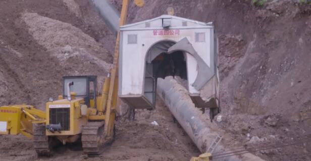 據介紹,施工使用了大型機械,由於山區地形複雜,施工者在上方用兩台大型機械對管道進行固定,在下方用三台機械維持管道的平衡,完成管道組對。