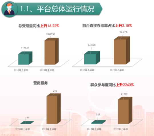 據介紹,海口“12345”平台總體運行狀況良好,2019上半年總受理量、前台直接辦結率、營商服務辦件總量、群眾參與度等均呈現上升趨勢;總體信訪形勢、重信訪量、安全生產事故、不滿意辦件等呈現持續下降態勢。