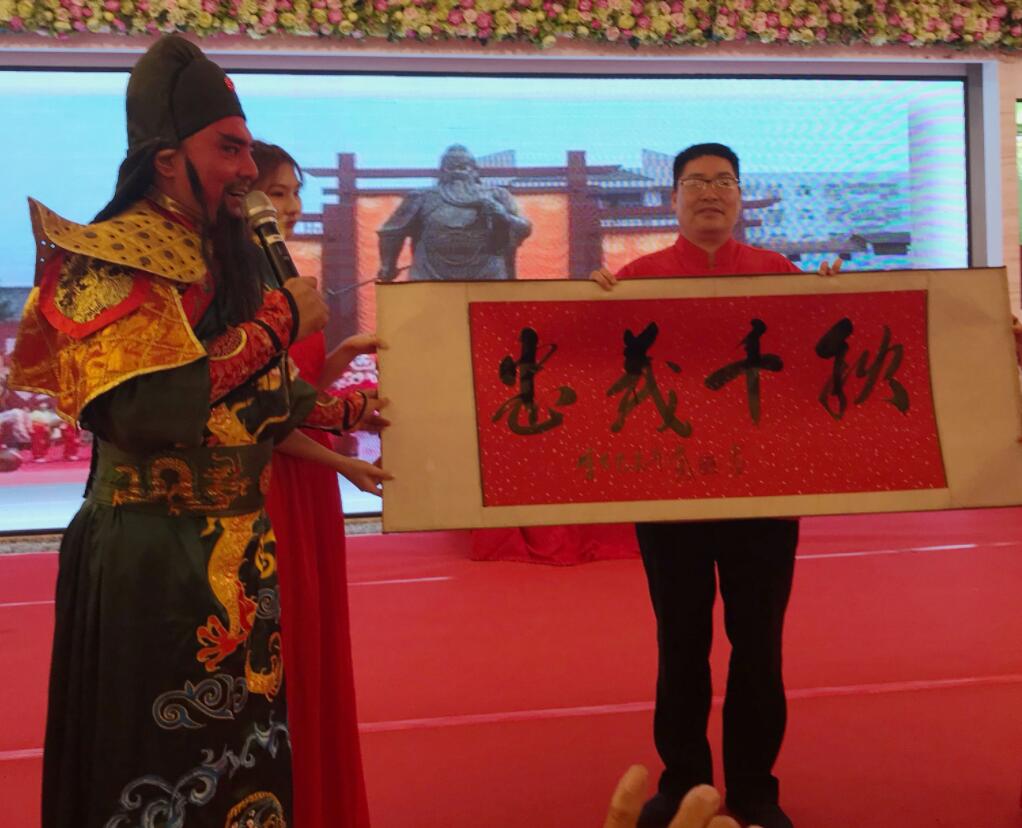 關公扮演者祝斌傑(左)前來祝興,右為世界關公文化聯合發展總會會長李成友
