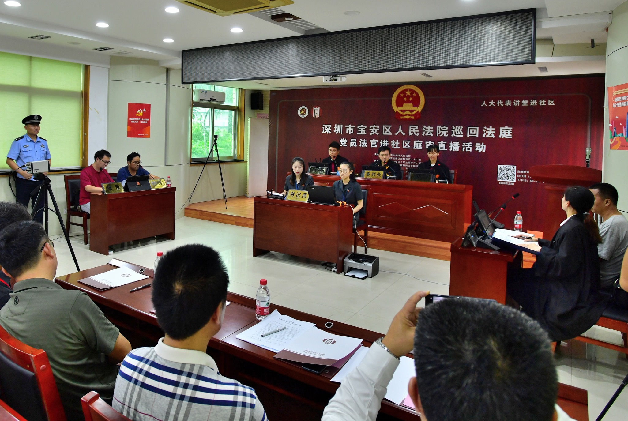 揭牌儀式結束後,在黃埔社區工作站三樓會議室開展了「人大代表講堂進社區」——巡迴審判進社區網絡直播活動。寶安區人大代表、沙井法庭庭長周斌,帶來法庭團隊,深入社區,讓社區居民可以直觀感受現場庭審。周斌代表對庭審過程、案件的基本情況,調解、處理過程進行了解讀,讓大家對法庭處理案件的過程有了深入的了解。本次庭審採用現場直播方式,以真實案件生動直觀對群眾進行普法宣傳,擴大普法效果。庭審結束後,區人大常委會主任張志彪首先「點贊」了區人民法院近年來的工作。區法院在區委的堅強領導下,認真貫徹落實了上級法院的工作部署,為切實做到依法司法、為民司法、公正司法做了大量的工作,使人民群眾的滿意度持續上升。此次區人民法院、沙井法庭創新的「黨員法官巡迴審判模式」,就是在日常依法開展工作的基礎上,進一步優化了服務群眾、惠及百姓的方式,為廣大人民群眾更多爭取了司法便利,大大拓寬了普法教育的渠道,讓法官幹警隊伍更接地氣、更深入群眾,讓群眾在每個案件中感受到公平正義,使改革發展成果惠及更多人民群眾。張志彪還「點贊」了新橋街道人大工委的工作開展的有聲有色,代表履職積極有為,取得成果可圈可點。他勉勵新橋街道人大工委要繼續做好「代表活動月」等各項人大工作,充分發揮出代表的主體作用,為新橋的經濟社會發展和民主法治建設,為寶安建設「灣區核心、智創高地、共享家園」以及深圳建設「中國特色社會主義先行示範區」做出新的更大貢獻。