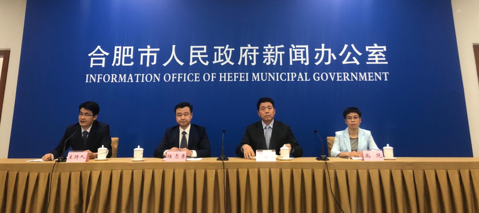 2019合肥國際馬拉松賽賽事規程發佈會現場,左起依次為合肥市委宣傳部外宣辦主任趙明錄主持發佈會,合肥國際馬拉松賽組委會副秘書長、合肥市體育局副局長陸志勇,市文化和旅遊局副局長丁海鷹,包河區濱湖功能區黨工委書記、管理服務中心主任高見