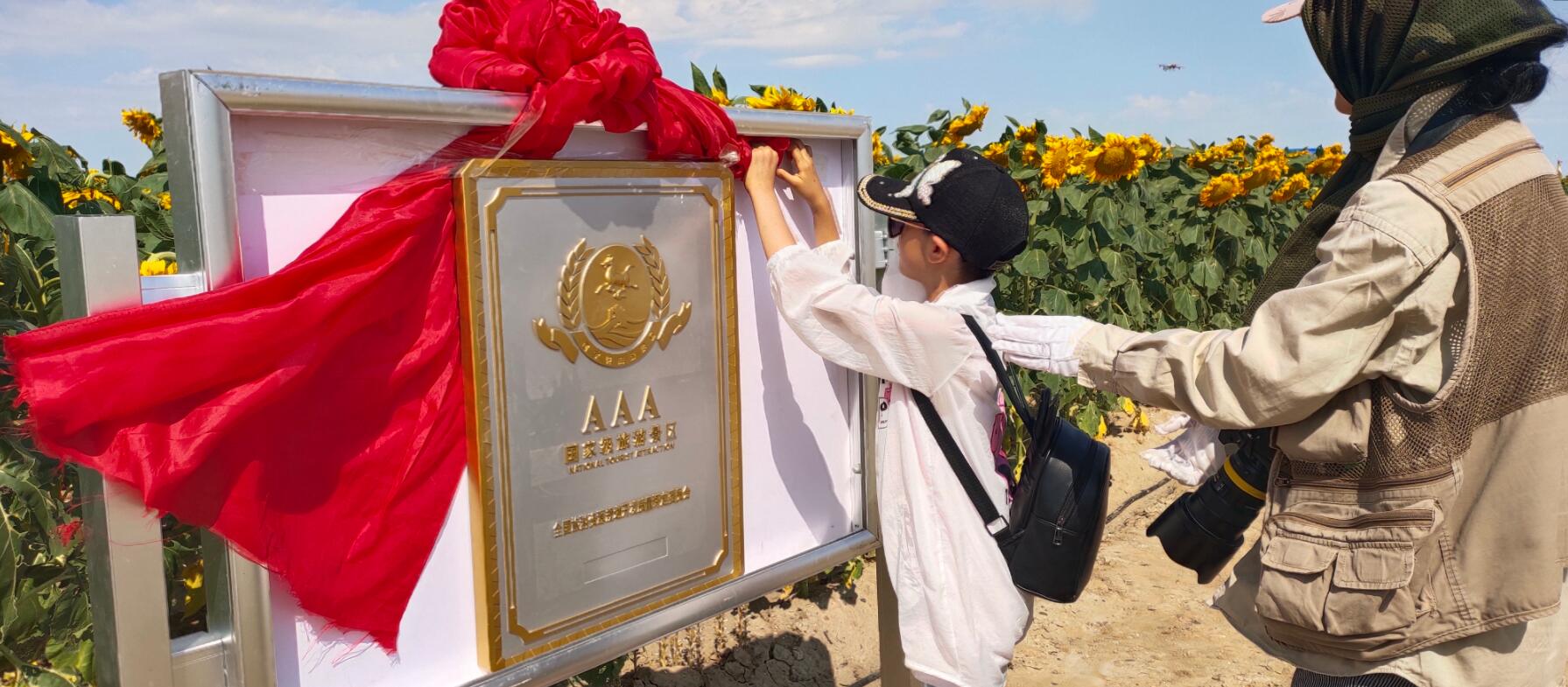 在葵花節現場,參賽選手準備在現代農業產業園國家AAA級景區牌子前攝像,記錄著這世間美景