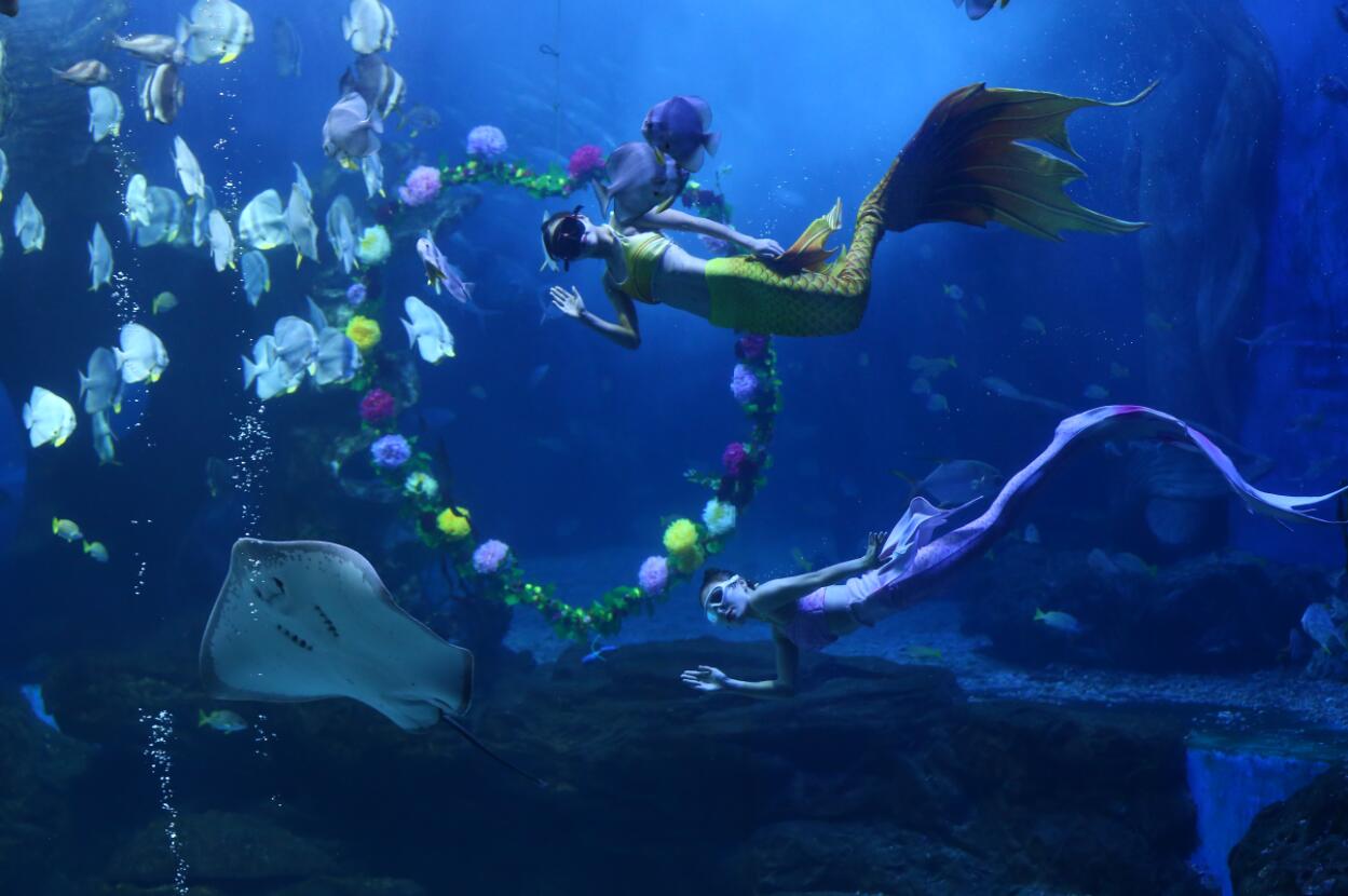 【香港商報網訊】為弘揚中國傳統文化,傳播正確的愛情觀,8月7日,多彩貴州城極地海洋世界的水下演員通過精心編排,把水下表演與傳統文化元素進行了有機結合,為遊客呈現了一段美麗動人的水下婚禮。