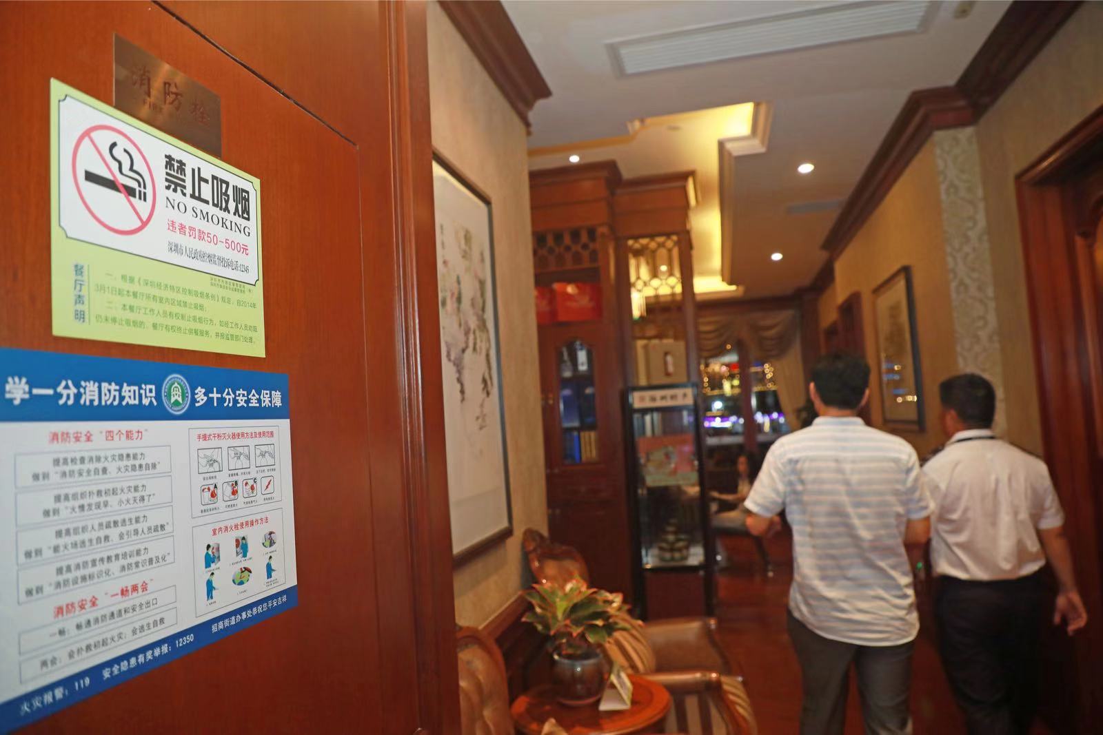 在隨後的一家餐廳內,記者看到牆上張貼了禁止吸煙標識,收銀台上也擺放了禁止吸煙公告,跟隨執法人員巡視一周後,同樣未發現違法吸煙行為。當天晚上,前海蛇口自貿區綜合執法局共派出9名工作人員參與控煙行動,佩戴執法儀全程記錄執法過程,然而輾轉7家餐廳,均未發現吸煙者。