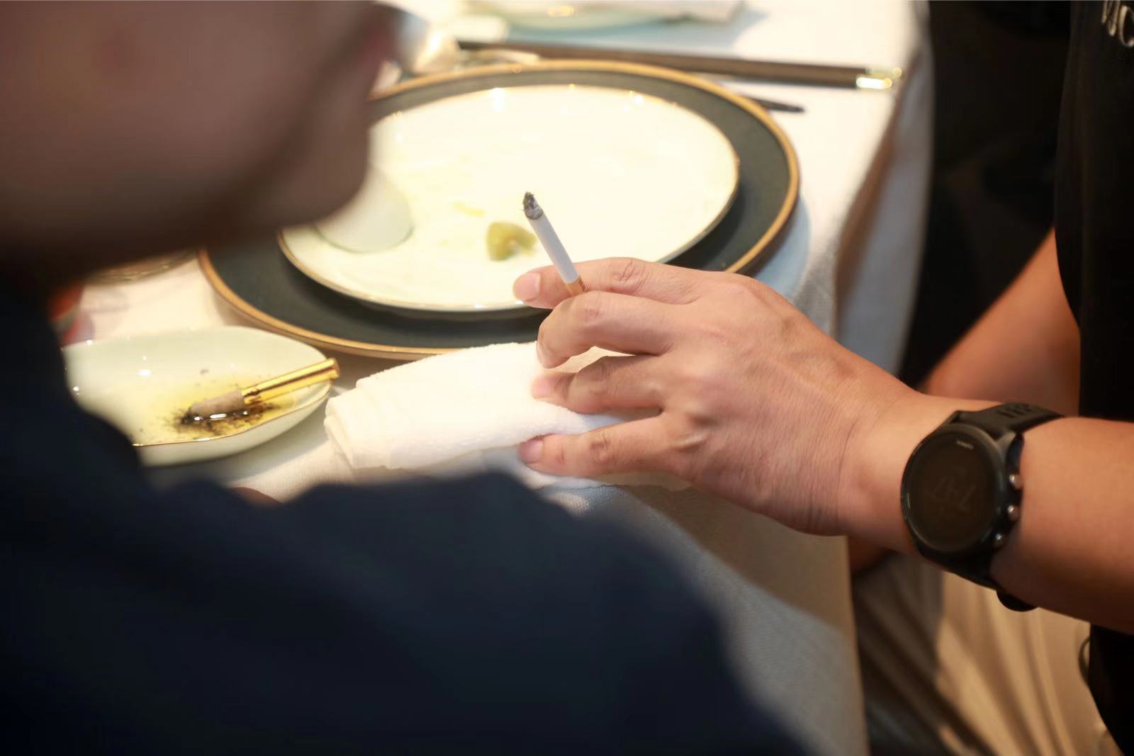 不過記者注意到,在一些餐廳的門口和走廊上,地上落了煙頭,可見部分餐廳內是存在違法吸煙行為的。直到當晚突擊到第8家餐廳,執法人員在一間包廂內才發現了兩名違法吸煙者。