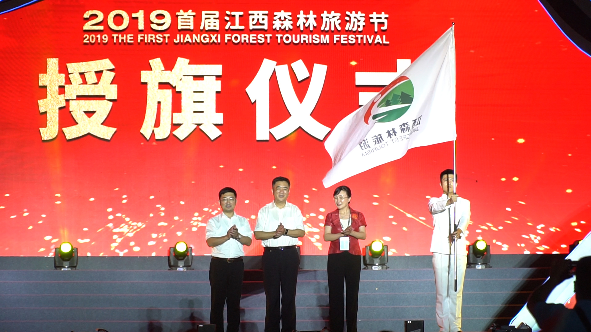 江西省人大常委會副主任朱虹(中)為第二屆江西森林旅遊節舉辦地大余縣授旗