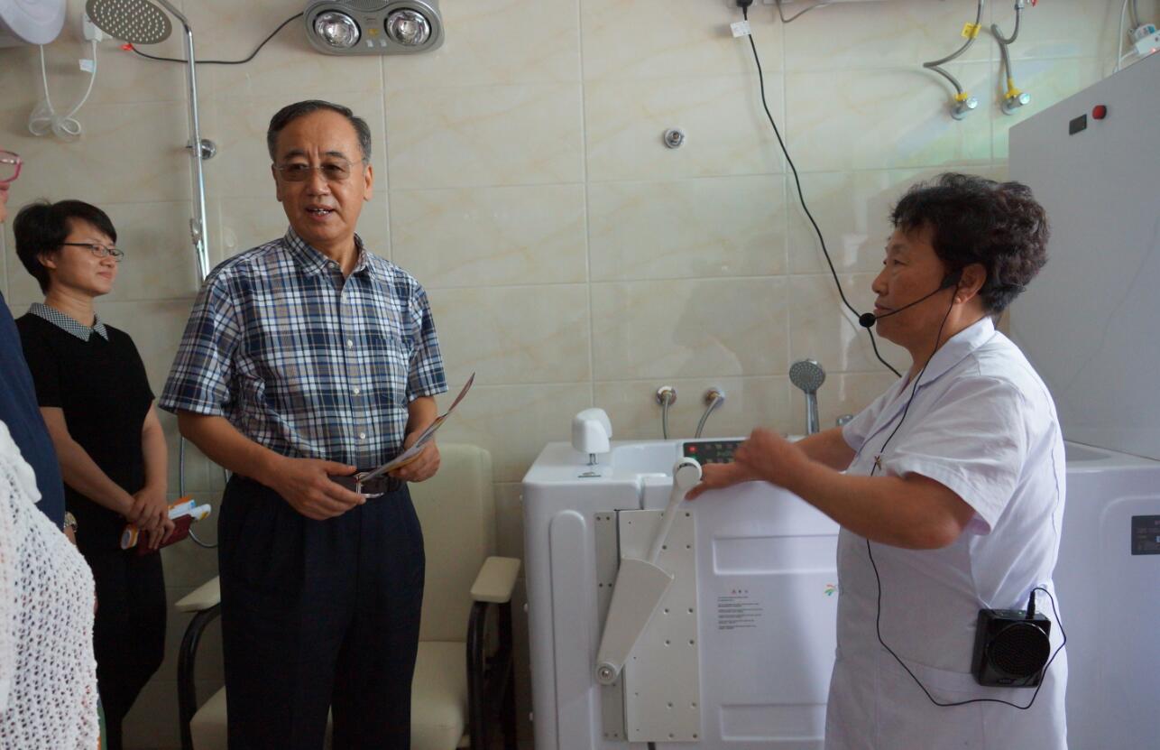 洮北區養老院負責人向吉林省老金會理事長劉潤璞介紹全自動洗澡機