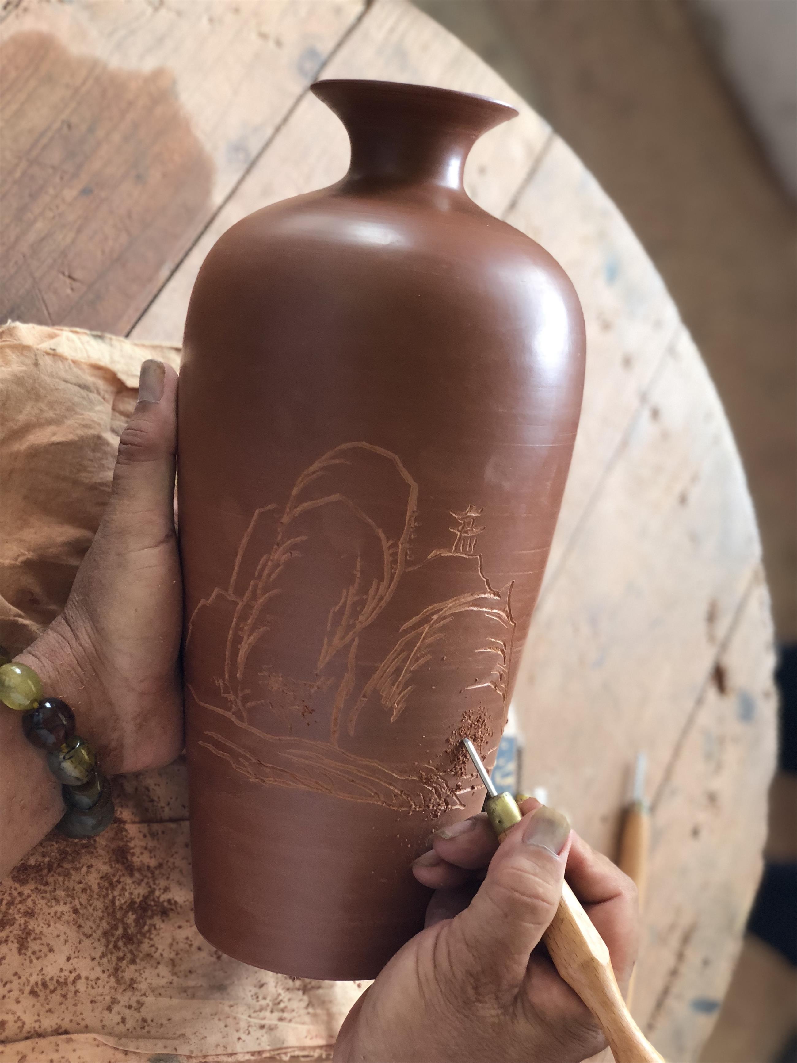 陶藝師在陶器上勾勒圖案