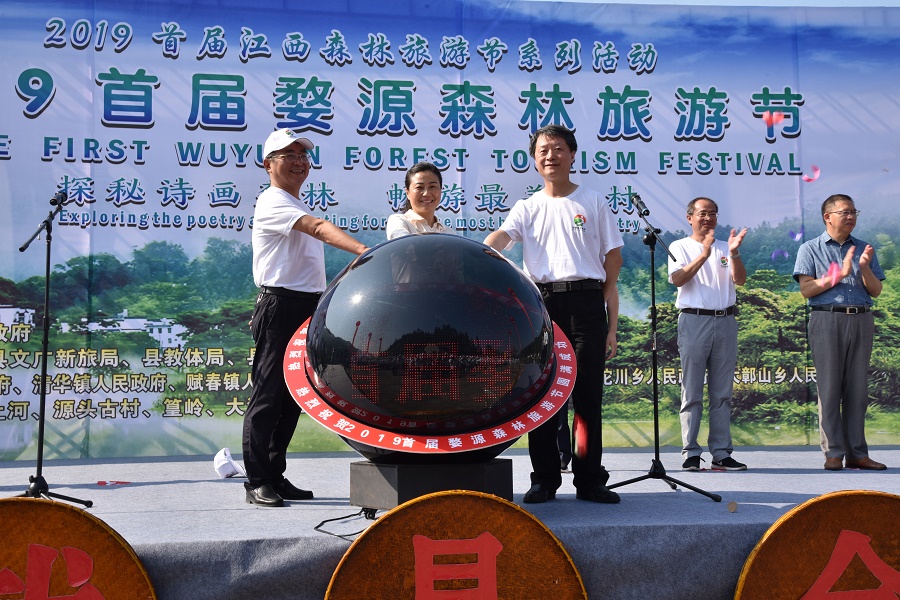 婺源縣委書記吳曙、江西省林業局老幹處處長楊小春、上饒市林業局黨組書記、局長吳步高共同為活動按下啟動球
