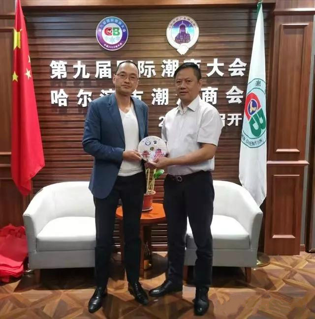 8月21日,高小華總經理一行到訪哈爾濱市廣東潮汕商會,鄭楚成主席贈與大會紀念品並親切合影