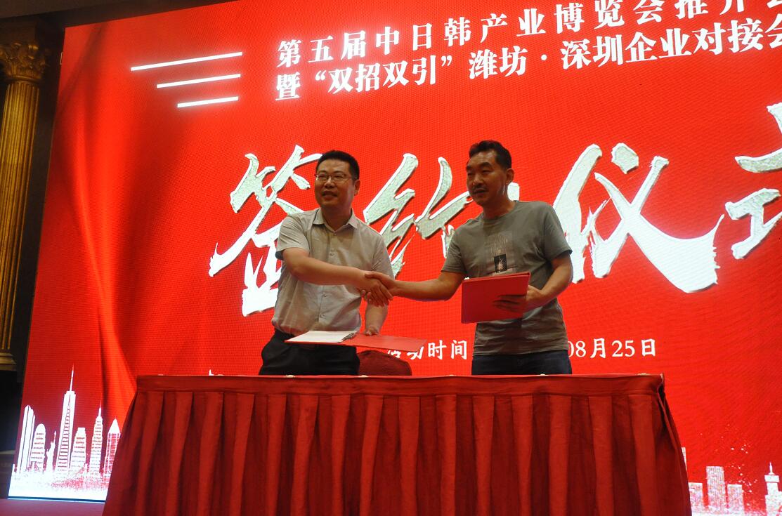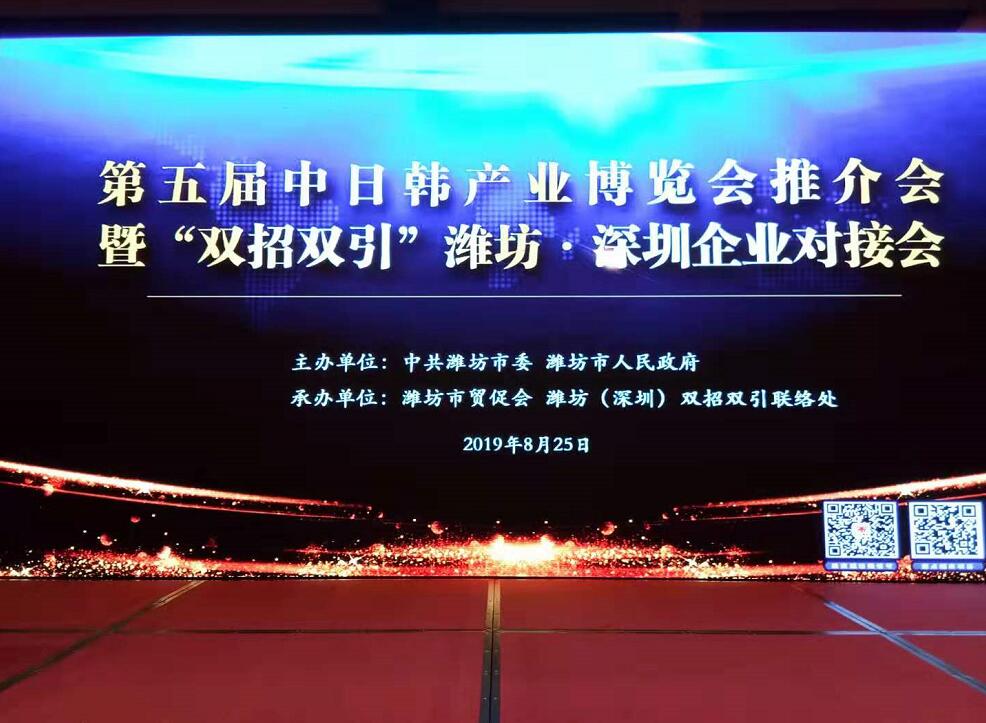 【香港商報網訊】記者 蘇偉 報導:8月25日下午,由濰坊市委、濰坊市人民政府主辦,濰坊市貿促會、濰坊(深圳)雙招雙引聯絡處承辦的第五屆中日韓產業博覽會推介會暨「雙招雙引」濰坊·深圳企業對接會在深圳舉行,來自港澳台地區 、珠三角地區及濰坊的近100家企業及商協會組織代表及20多家新聞媒體的記者參會。