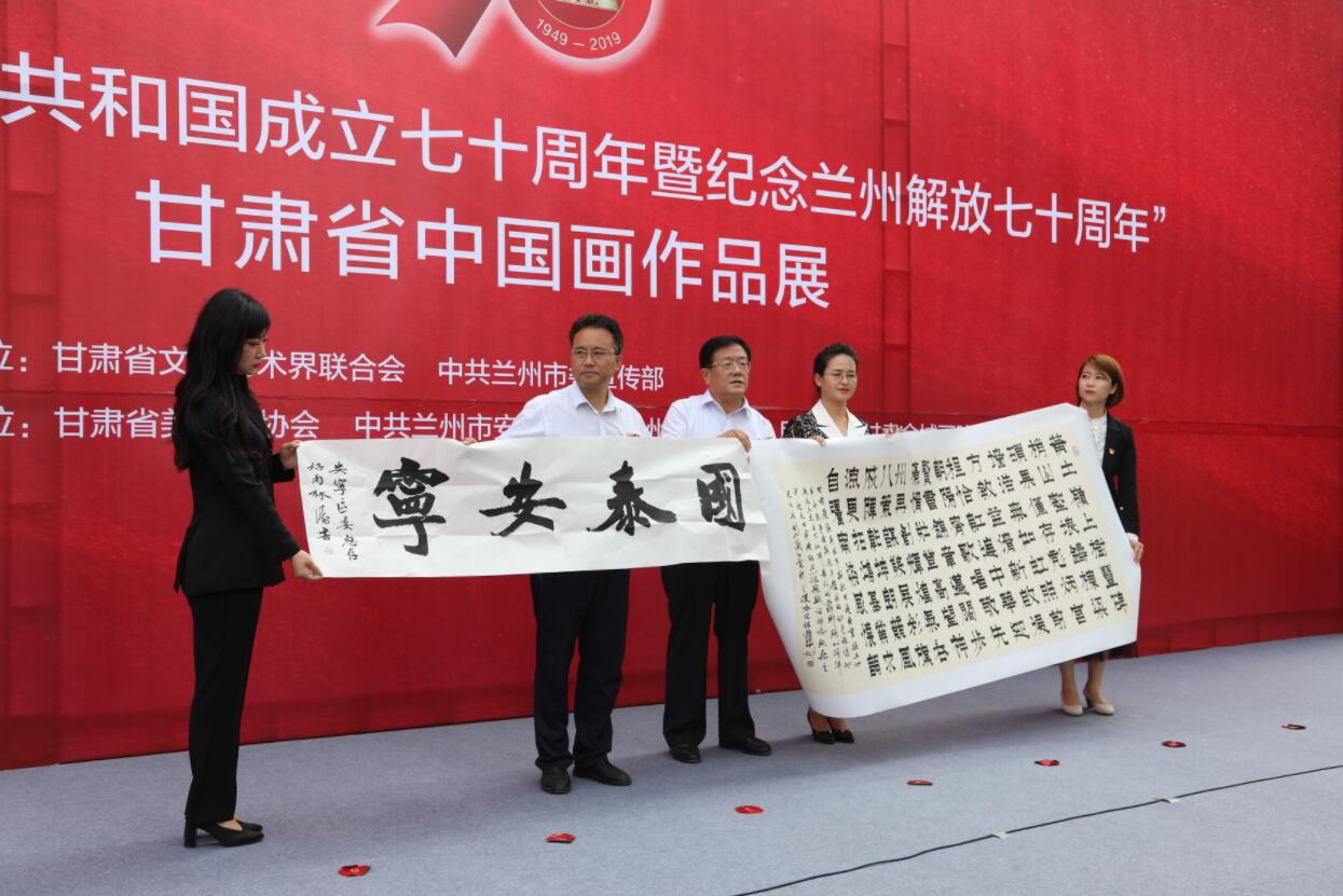 甘肅省文聯黨組書記、主席王登渤表示,近年來金城蘭州作為西北重鎮和樞紐城市,在傳承華夏文明、融通絲路文化、促進交流合作方面發揮了重要作用,有力地促進了甘肅文化藝術以及社會各方面的發展進步。“慶祝中華人民共和國成立七十周年暨紀念蘭州解放七十周年甘肅省中國畫作品展”在蘭州市安寧區舉辦充分體現了新時代全省美術工作者和金城人民群眾對傳承繪畫藝術、弘揚時代精神的美好願望和生動實踐,體現了藝術家們始終堅持以人民為中心的創作導向,堅持思想精深、藝術精湛、製作精良相統一的創作要求,展示了藝術家以筆墨語言表達中華美學精髓、描繪隴原兒女良好精神風貌的創作熱誠。