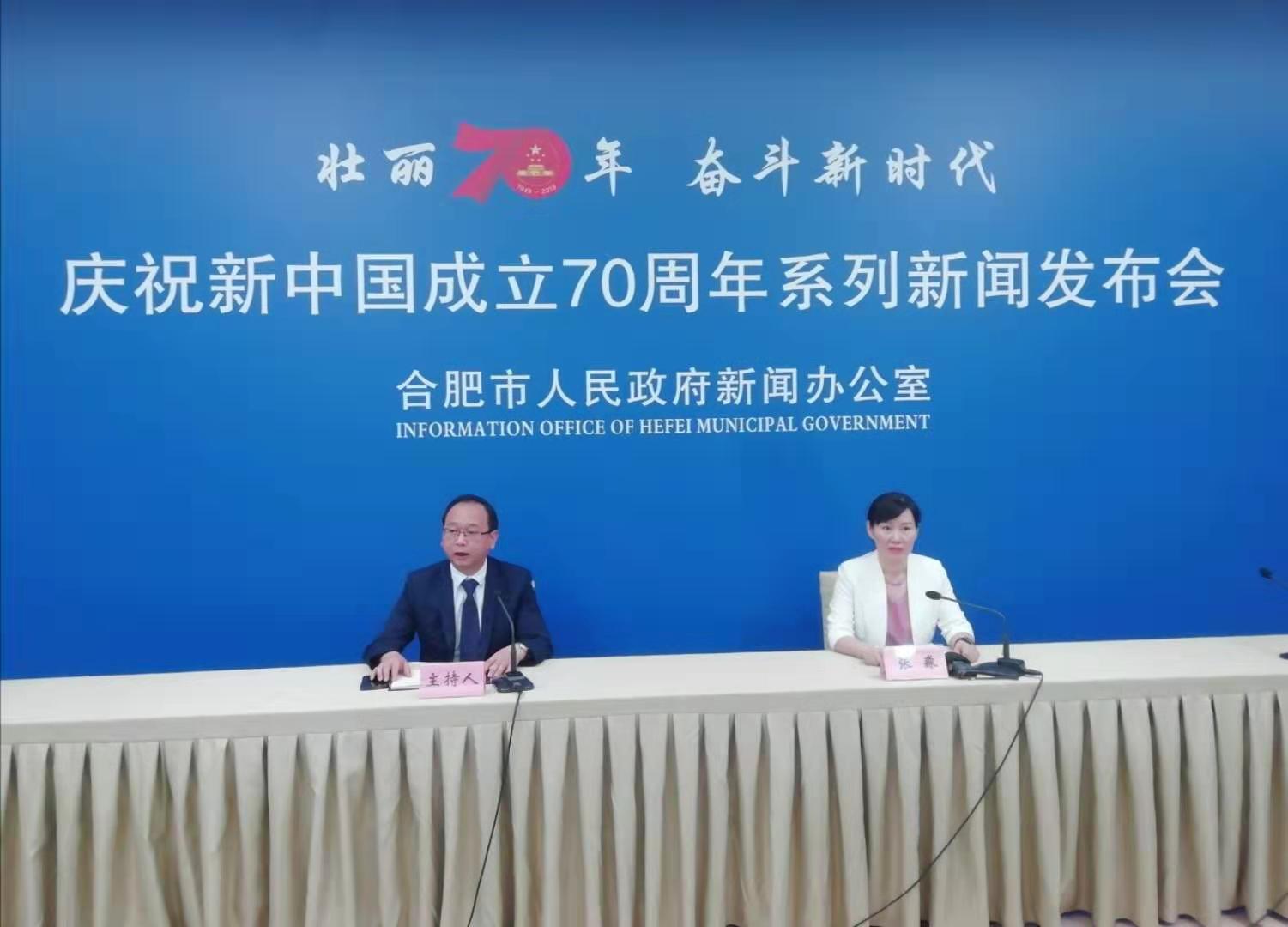 「壯麗70年。奮鬥新時代」合肥慶祝新中國成立70周年系列新聞發佈會現場。左:合肥市政府新聞辦公室主任王立群主持發佈會,合肥市場監管局副局長張淼介紹相關情況(孫軍 /攝)