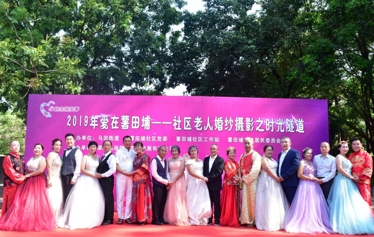 【香港商報網訊】8月27日,由深圳光明區馬田街道、薯田埔社區黨委、薯田埔社區工作站、薯田埔社區居民委員會主辦,深圳弘揚烙畫藝術發展有限公司承辦的「愛在薯田埔社區——老人婚紗攝影之時光隧道」為主題的老年人婚紗攝影活動,在光明區薯田埔社區龜山公園舉辦。