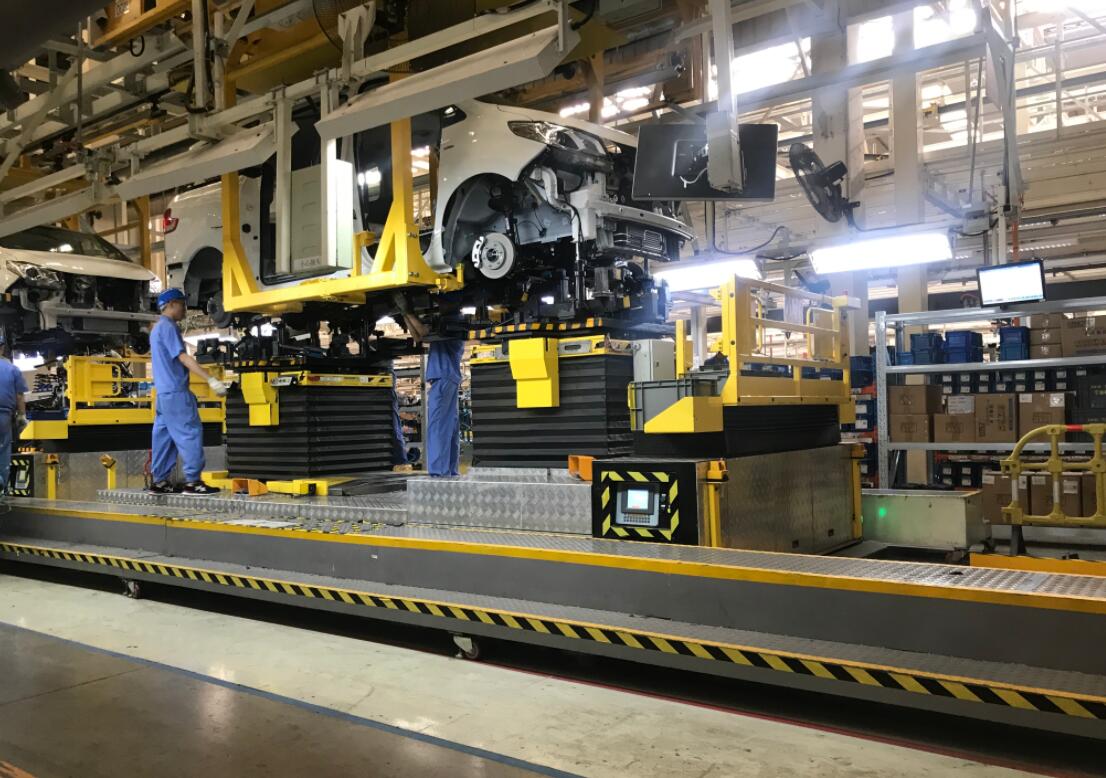 上汽大通無錫基地總裝車間內,AGV小車輔助車身合拼