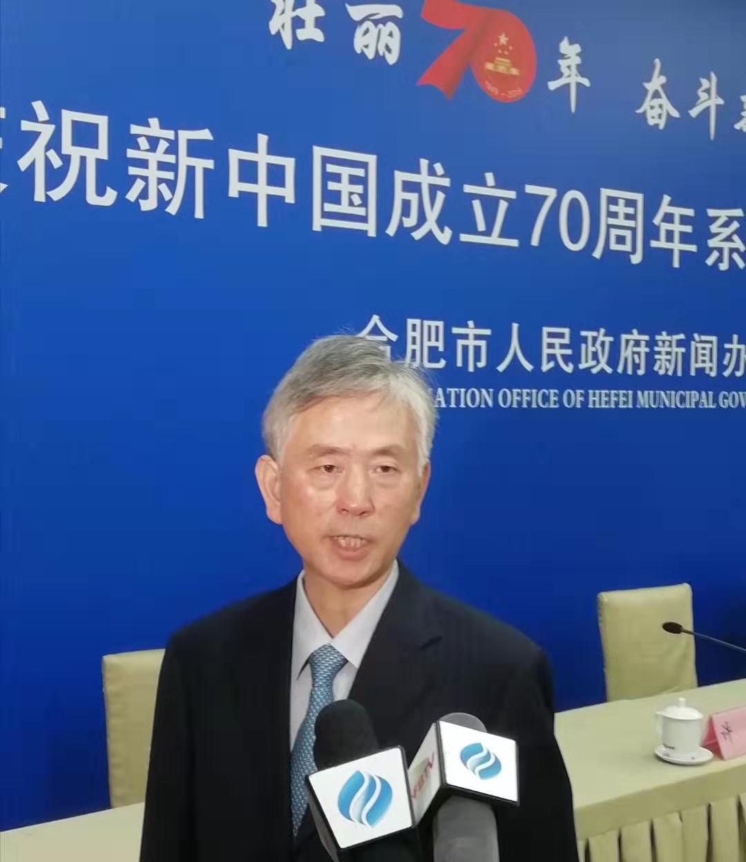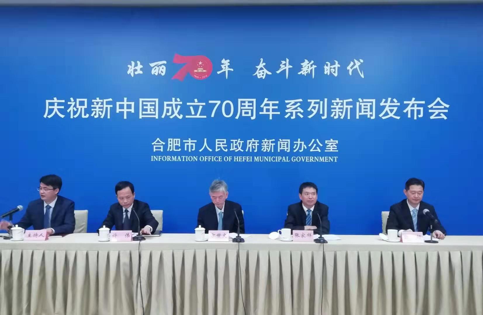「壯麗70年 奮鬥新時代」合肥市慶祝新中國成立70周年系列新聞發佈會現場,左起:合肥市委宣傳部外宣辦主任趙明錄主持發佈會,合肥市發改委總工程師許偉,合肥市交通運輸局局長方世文,合肥市重點工程建設管理局局長張家祥,合肥市城鄉建設局副局長張超先後介紹相關情況(孫軍/攝)