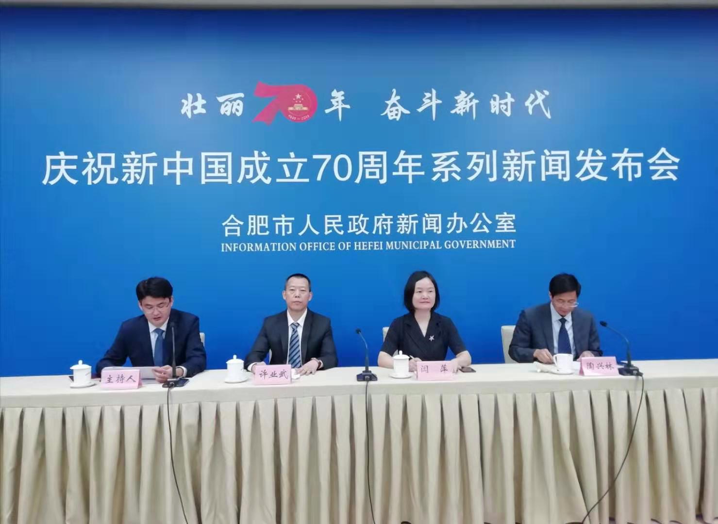 「壯麗70年 奮鬥新時代」合肥市慶祝新中國成立70周年系列新聞發佈會現場。左起:合肥市委宣傳部外宣辦主任趙明錄主持發佈會,合肥市公共資源交易監督管理局副局長許業武、合肥市政府副秘書長閆萍、合肥市政務服務管理局局長陶興林先後介紹相關情況(孫軍 攝)