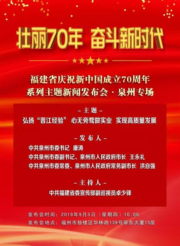 福建省慶祝中華人民共和國成立70周年系列主題新聞發佈會·泉州專場將於9月5日在福建省政府新聞發佈廳召開