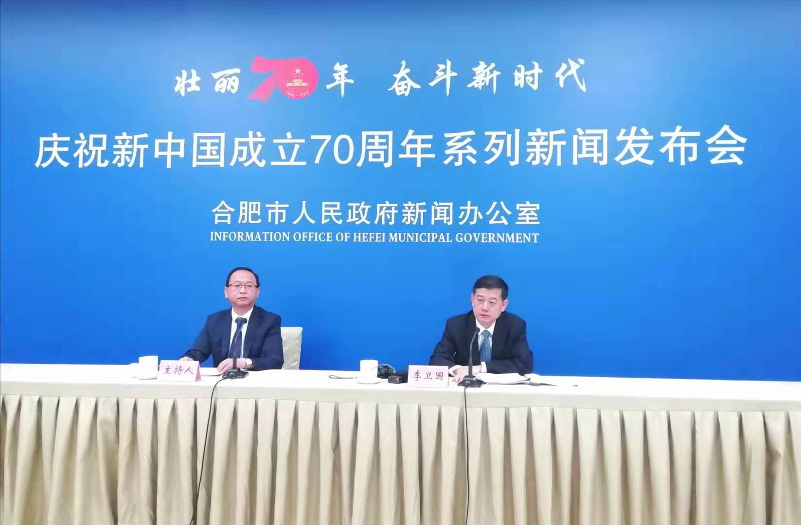 「壯麗70年 奮鬥新時代」合肥市慶祝新中國成立70周年系列新聞發佈會現場。左起:合肥市人民政府新聞辦公室主任王立群主持發佈會,合肥市委組織部副部長李衛國介紹有關情況並回答記者提問(孫軍 攝)