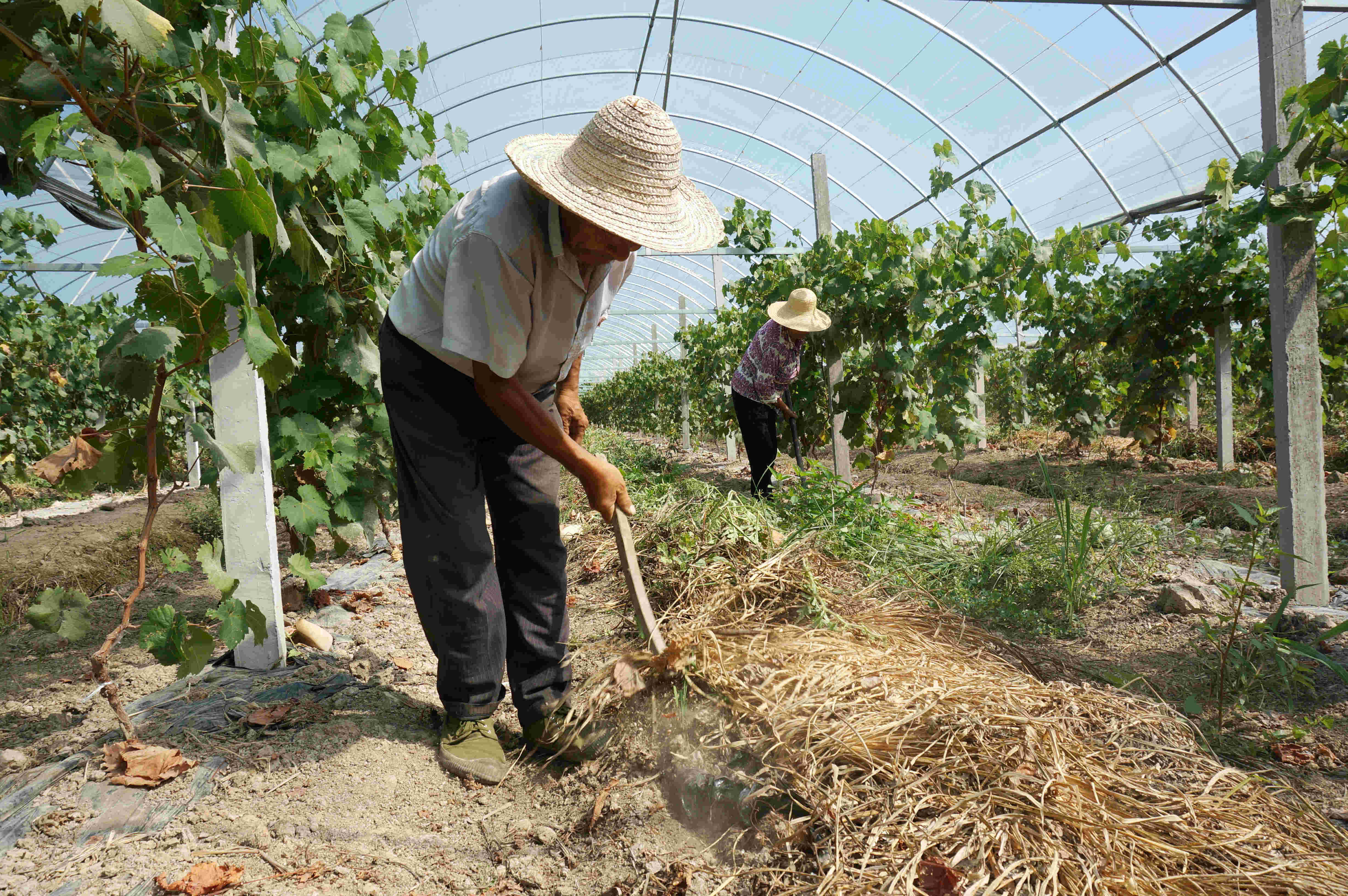 8月30日,在壽縣劉崗鎮謝墩村葡萄生態農業示範基地,70歲的建檔立卡貧困戶孫顯平正在大棚里清理西瓜收穫後留下的藤蔓。他的老伴站在一旁,精心整理架子上的葡萄藤。
