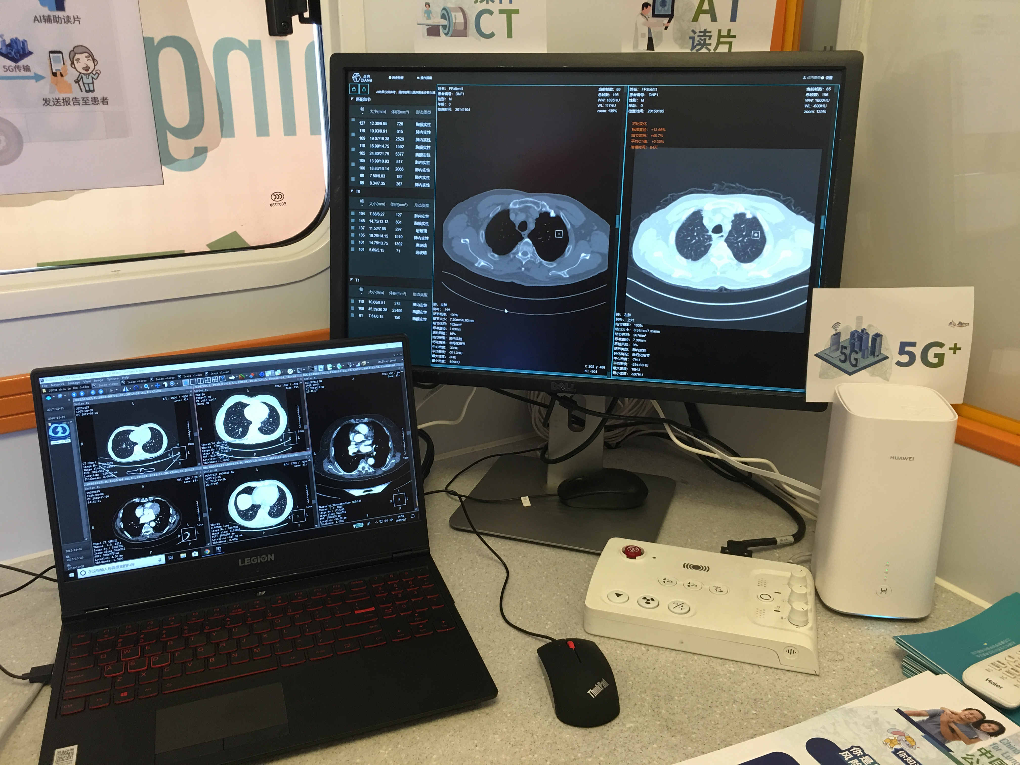 5G在醫療領域或將為患者帶來更多希望,幫助醫生提高診斷效率。本屆物博會上,阿斯利康聯合點內科技、艾瑞克醫療車進行了首台肺癌篩查車展示。項目負責人告訴記者,肺癌在內地已經成為男性死亡的「頭號殺手」。實際上,如果能及時診斷患者體內的肺小結節,可以挽救生命,也能節約大量醫療資源。肺癌篩查車以車的形式可以將CT篩查帶到偏遠地區,患者躺上CT機後,生成的相關數據經過AI計算,70秒左右可以得到一個初步的診斷結果,再通過5G網絡高速傳輸給遠程會診的醫生,醫生可以在AI的輔助下,完成高效的診斷工作。