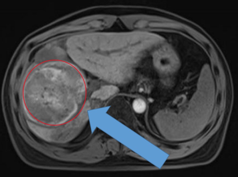 標記出肝右葉巨大腫瘤