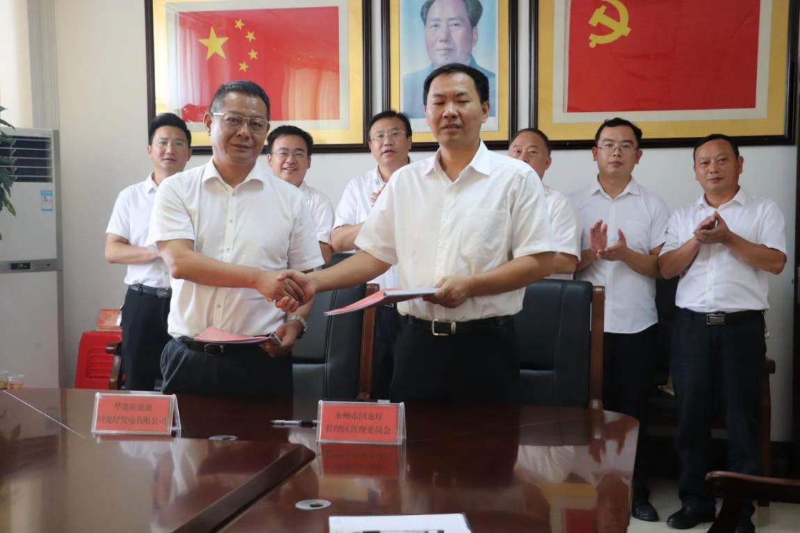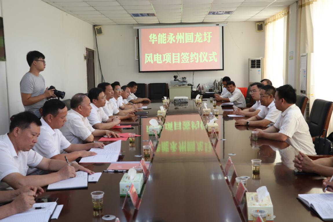 回龍圩管理區黨委副書記、管委會主任劉功文代表管理區與華能湖南清潔能源分公司總經理、華能新能源湖南風電項目籌備處主任郝明波簽約,標誌着回龍圩管理區在新能源開發利用上邁出了嶄新的步伐。(容散龍 唐勇平 李銀明)