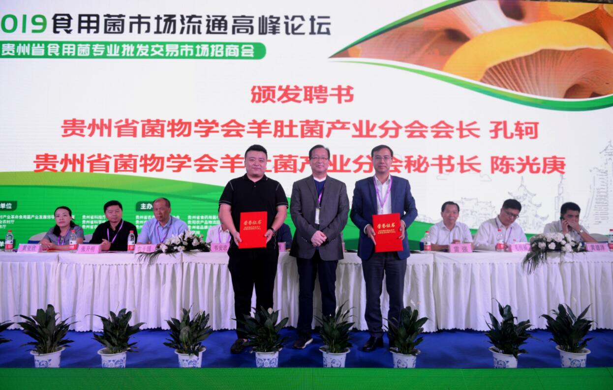 當天會上,出席會議相關領導宣讀了貴州省菌物學會關於成立羊肚菌產業分會的批覆並為理事會成員頒發聘書,同時為貴州省食用菌專業批發交易市場最具影響力商戶以及貴州食用菌市場高峰論壇突出貢獻獎單位和個人頒發榮譽。貴州省民生大數據綜合應用工程研究中心主任周宇航與貴州易農雲大數據有限公司總經理溫品發籤訂了聯建貴州省食用菌大數據綜合應用實驗室。