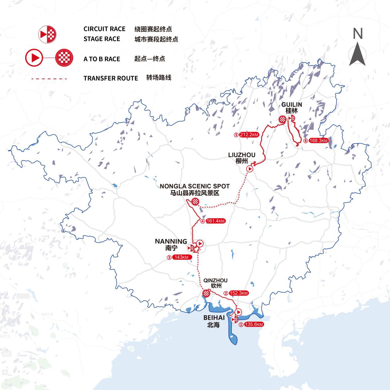 據介紹,2019格力「世巡賽·環廣西」比賽路線在基本延續去年路線的基礎上,做了優化調整,路線總長973公里。與2018年相比,北海賽段的起點從北海海灘公園改到了北海園博園;南寧市內比賽路線圍繞青秀山、五象新區布設;南寧—馬山賽段起點由原來的青秀萬達變更為廣西文化藝術中心,市內路線少部分道路變更,終點向景區延伸約1.4公里;作為整個賽事的皇后賽段,馬山弄拉景區賽段的爬坡賽道不僅增加了賽事難度和精彩程度,這一賽段的成績也將對賽事總冠軍的歸屬產生決定性影響。