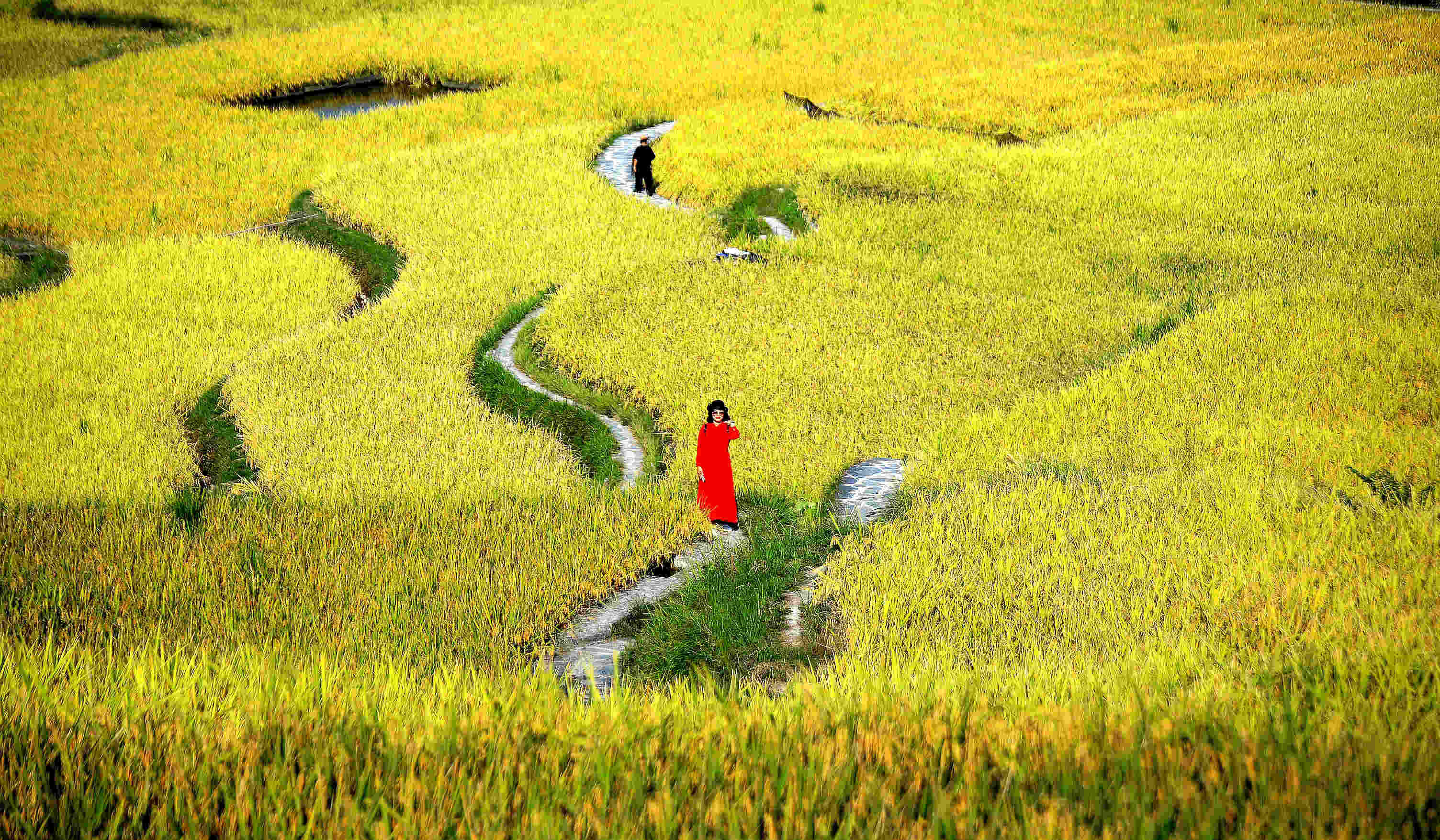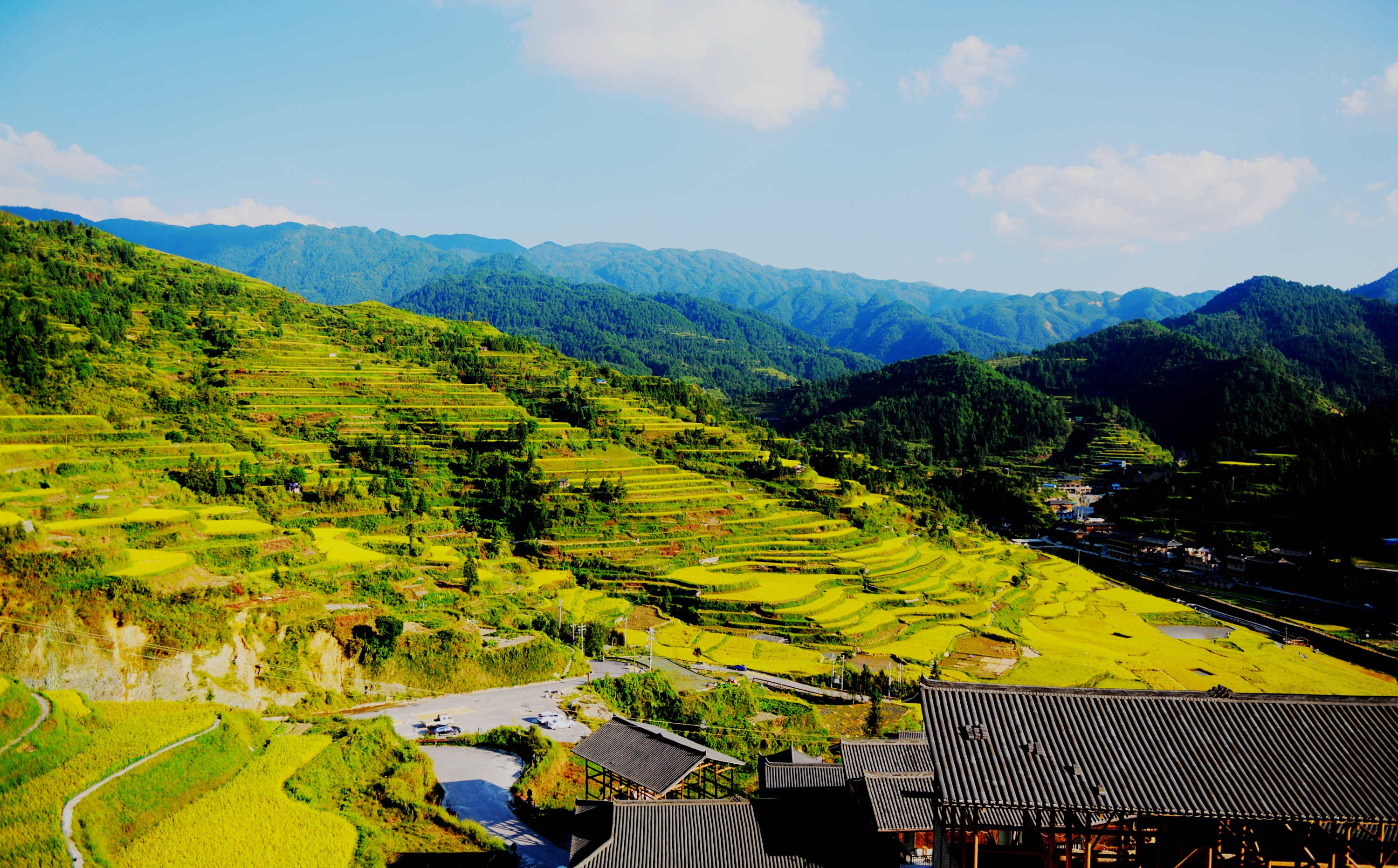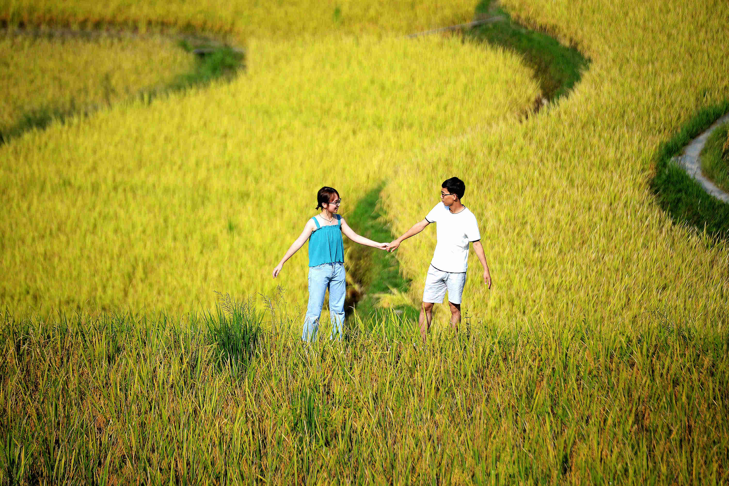 從山頂蜿蜒到山腳的梯田裡,入眼儘是金燦燦的稻子,有的甚至就在吊腳樓下,一派秋色美不勝收。在秋風颯爽中行走其間,顆粒飽滿的稻穗隨風搖曳,田裡稻浪翻騰,金光閃閃,與長天秋水,鳥語蟲鳴交織,美得讓人沉醉。