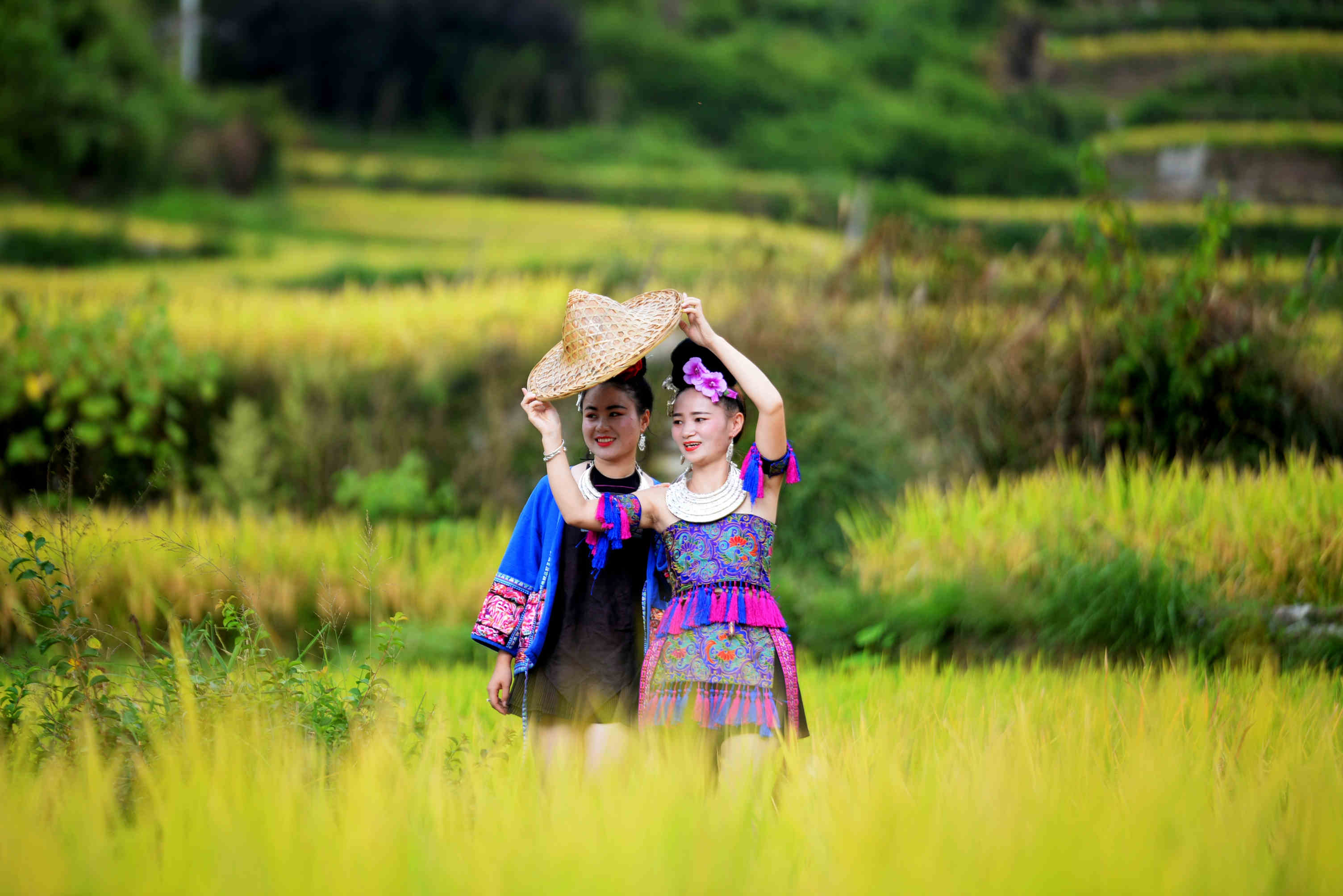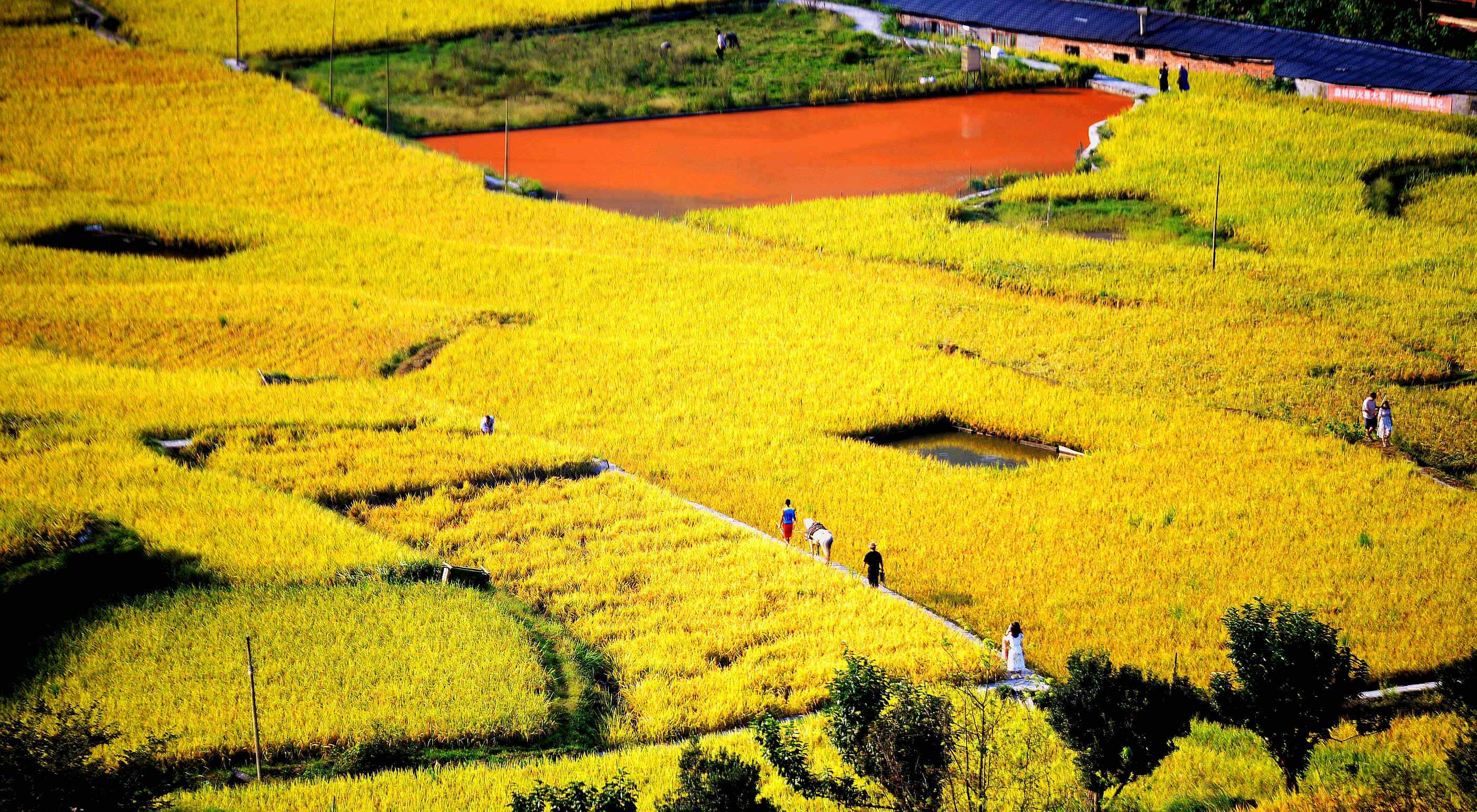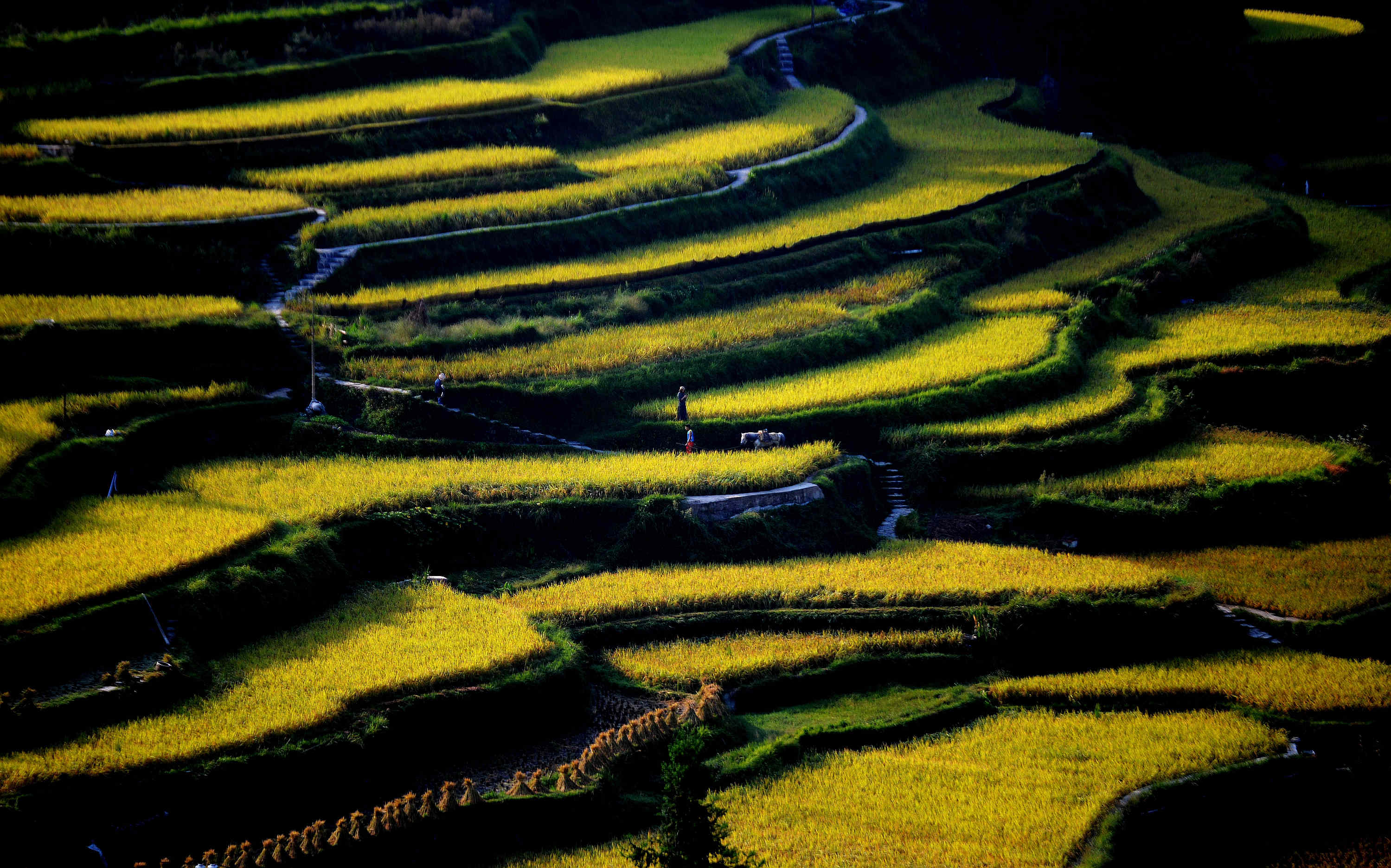 從山頂蜿蜒到山腳的梯田裡,入眼儘是金燦燦的稻子,有的甚至就在吊腳樓下,一派秋色美不勝收。在秋風颯爽中行走其間,顆粒飽滿的稻穗隨風搖曳,田裡稻浪翻騰,金光閃閃,與長天秋水,鳥語蟲鳴交織,美得讓人沉醉。