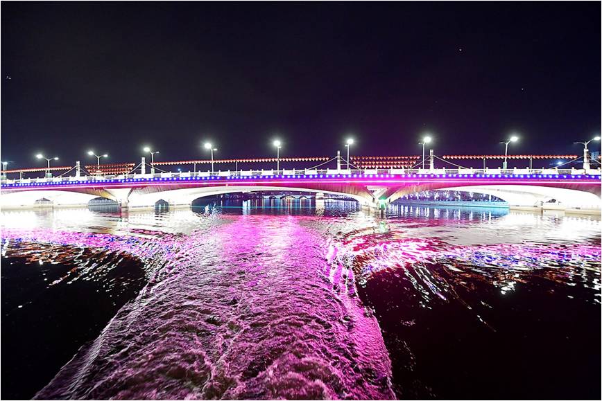曾贊榮、趙磊首先來到大光樓,察看北關攔河閘(七孔橋)及千荷泄露橋燈光照明,隨後由奧體公園碼頭乘船,沿途察看運河沿岸景觀亮化提升工程,及潞陽橋燈光照明、北運河大橋(通濟路)水幕系統、大運河森林公園「春夏秋冬」季節模式燈光變換等情況。