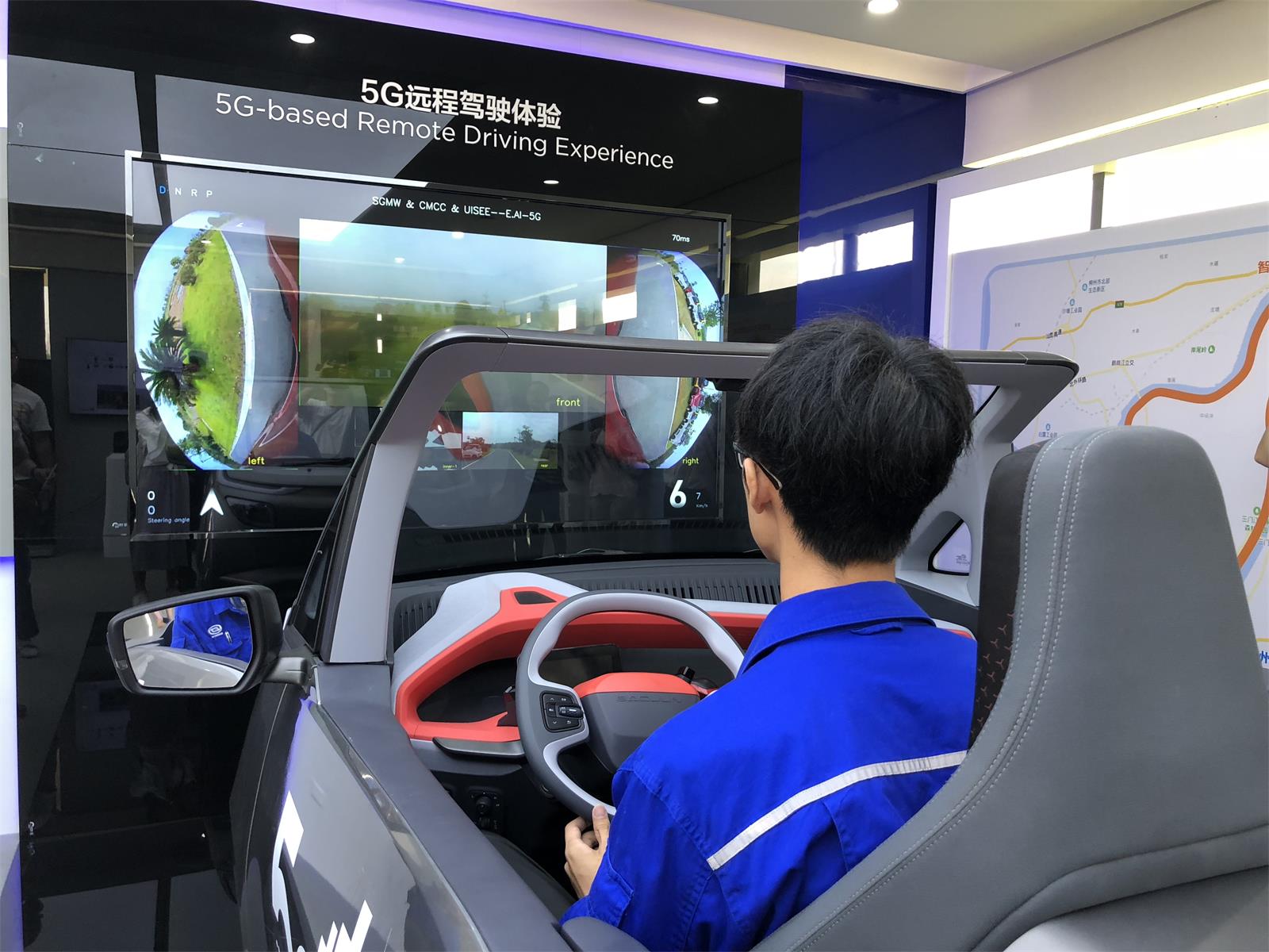 工作人員展示寶駿新能源汽車5G遠程駕駛