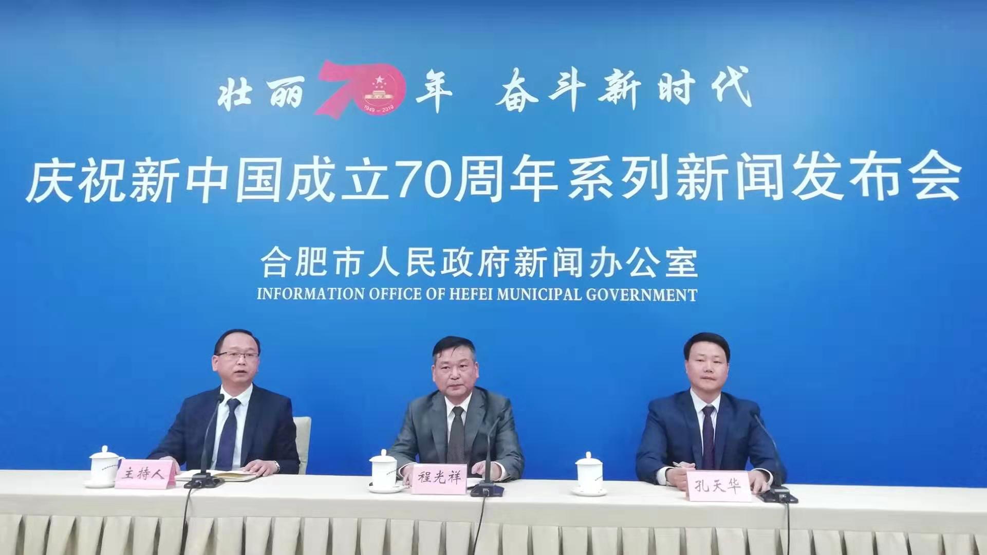 「壯麗70年 奮鬥新時代」合肥市慶祝新中國成立70周年系列新聞發佈會現場。左起:合肥市人民政府新聞辦公室主任王立群主持發佈會,合肥市民政局副局長程光祥,合肥市財政局副局長孔天華先後介紹有關情況並回答記者提問(孫軍/攝)