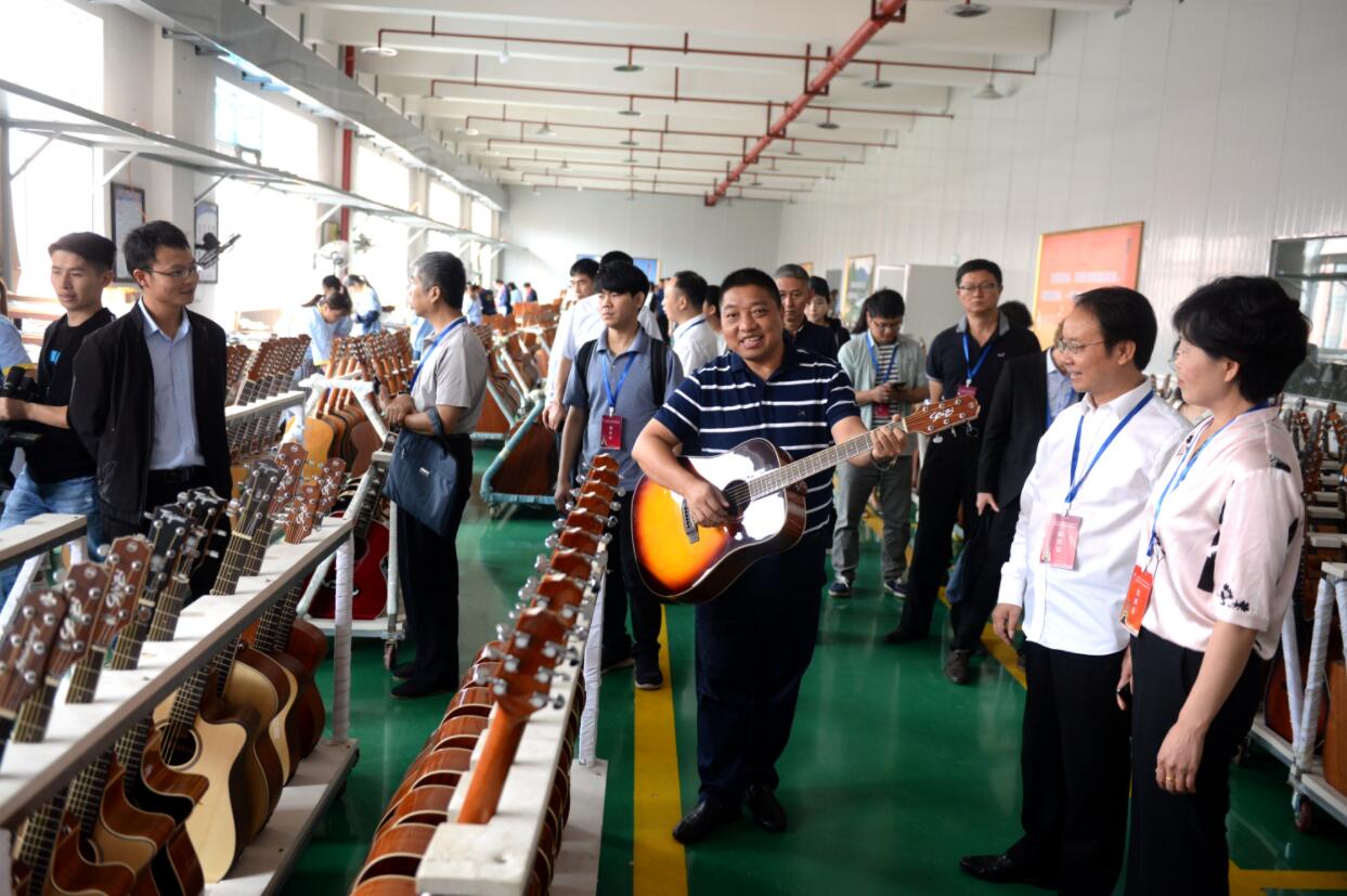 當天上午,嘉賓一行前往鈺豐樂器(正安)有限公司、遵義市馬氏吉他製造有限公司、貴州貝加爾樂器有限公司和遵義市神曲樂器製造有限公司等參觀吉他生產的一系列過程,並聽取相關公司負責人介紹貴州正安中國吉它製造之鄉如何助推村民脫貧攻堅緻富的經驗。
