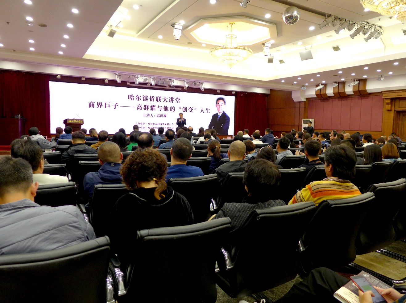 【香港商報網訊】為喜迎新中國成立70周年,更好地凝聚海內外僑胞力量共謀家鄉發展,讓僑智、僑力成為推動哈爾濱全面振興全方位振興的不竭動力。由哈爾濱市僑聯主辦、哈爾濱華濱電訊有限公司協辦的哈爾濱僑聯大講堂《商界巨子—高群耀與他的「創變」人生》專題講座在友誼宮舉行。講座前,黑龍江省僑聯黨組書記、主席郭占力,哈爾濱市委常委、統戰部部長梁野會見了高群耀博士,郭占力向高群耀博士頒發了省華僑國際文化交流協會副會長聘書,梁野向高群耀博士頒發了市僑聯海外顧問聘書。市委統戰部常務副部長張玉勇,市委統戰部副部長曹弘峰,市僑聯黨組書記、專職副主席申建平,主席陳佐東、副主席陳偉民、秘書長楊為濤等參加會見。哈市僑界代表、海歸僑青、專家學者、企業家代表及社會各界人士300多人聆聽講座。申建平主持講座。
