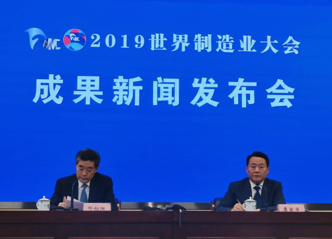 2019世界製造業大會成果發佈會在合肥舉行。左起:安徽省委常委、常務副省長鄧向陽發佈大會成果,省委常委、宣傳部部長虞愛華主持
