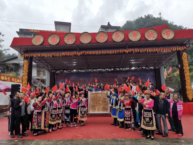 隨後進行的「豐收豆腐乾」展示,更是讓許多慕名而來的遊客大開眼界。據介紹,北川小壩出產高山黃豆,由高山黃豆做成的「小壩豆腐乾」,早已名聞遐邇。活動現場,四名羌族漢子抬着一塊長1.2米、厚10厘米、重達70斤的巨型豆腐乾走進現場,豆腐乾上的「豐收」兩個大字格外醒目。現場來賓及群眾圍着巨型「豐收豆腐乾」唱起《我和我的祖國》,共同祝願偉大的祖國繁榮昌盛。「豐收展」上,廣大脫貧戶和種養大戶意氣風發地展出了冬桃、魔芋、山藥、藥材、生態豬肉、土蜂蜜等系列北川羌鄉綠色生態農產品,吸引着無數觀眾駐足欣賞並爭相購買。