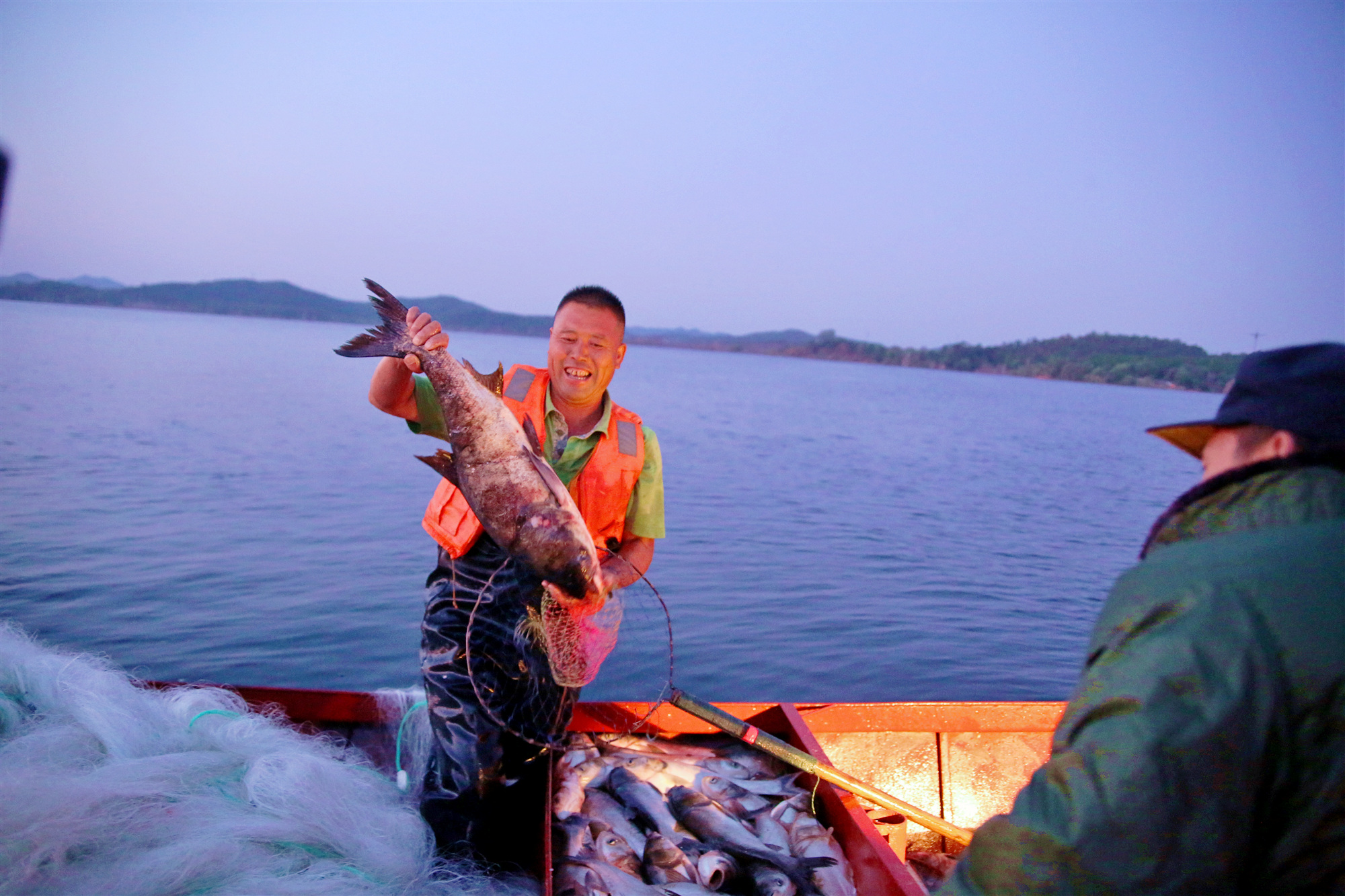 夜晚微涼,漁民們兩人一船,慢慢搖着兩片船槳駛入庫區深處。據了解,他們需要行駛1個小時到達捕魚地點,大約2-3個小時下網、起網,再帶着滿艙收穫回到岸邊。溪翁庄鎮走馬庄村的村民萬明泉在水庫里捕魚十幾年,經過一夜作業,他收穫了將近五六百斤的水庫魚:「我這打上最多的是胖頭魚,最大的估摸有15斤,希望第一網魚能賣個好價錢。」