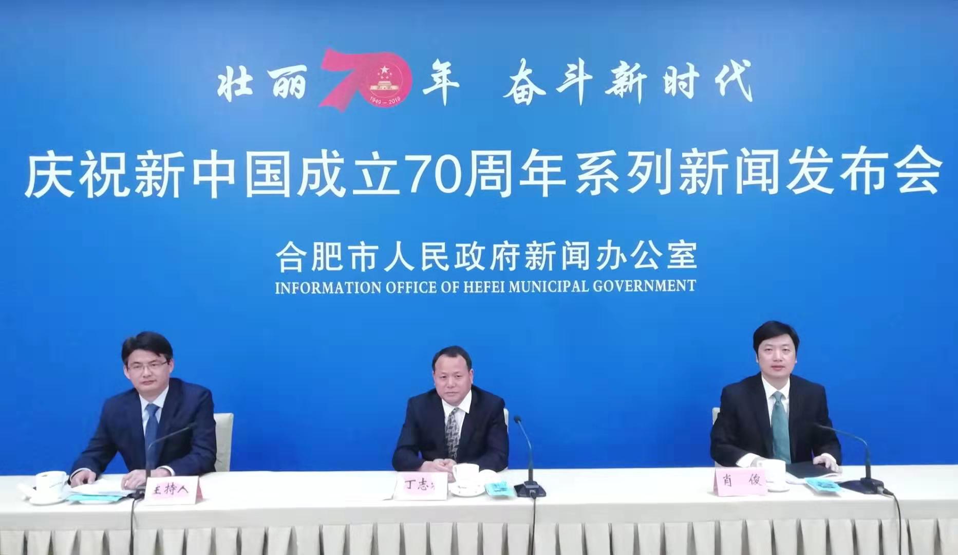「壯麗70年 奮鬥新時代」合肥市慶祝新中國成立70周年系列新聞發佈會現場。左起:合肥市委宣傳部外宣辦主任趙明錄主持發佈會,合肥市生態環境局局長丁志松,合肥市環湖辦副主任肖俊先後介紹相關情況(孫軍/攝)