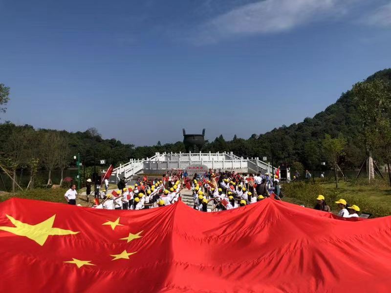 近百名江西安遠青少年與來自內地、香港等地的遊客在東江源頭江西贛州安遠縣三百山上,共同揮舞國旗、同唱《我和我的祖國》