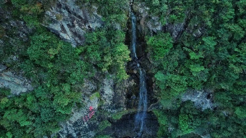 航拍鏡頭下的三百山,林海涌動,群峰連綿,東江源瀑布從百丈懸崖飛瀉而下,恰似銀河落九天